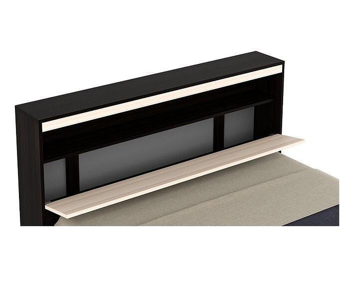 Изголовье кровати представляет собой откидной блок с дополнительной секцией для хранения постельных принадлежностей (подушек, одеял и постельного белья). Очень практичное решение, особенно в том случае, когда количество жилого пространства ограничено. Кровать не только украшает интерьер, но и делает спальное место поистине комфортным и функциональным.