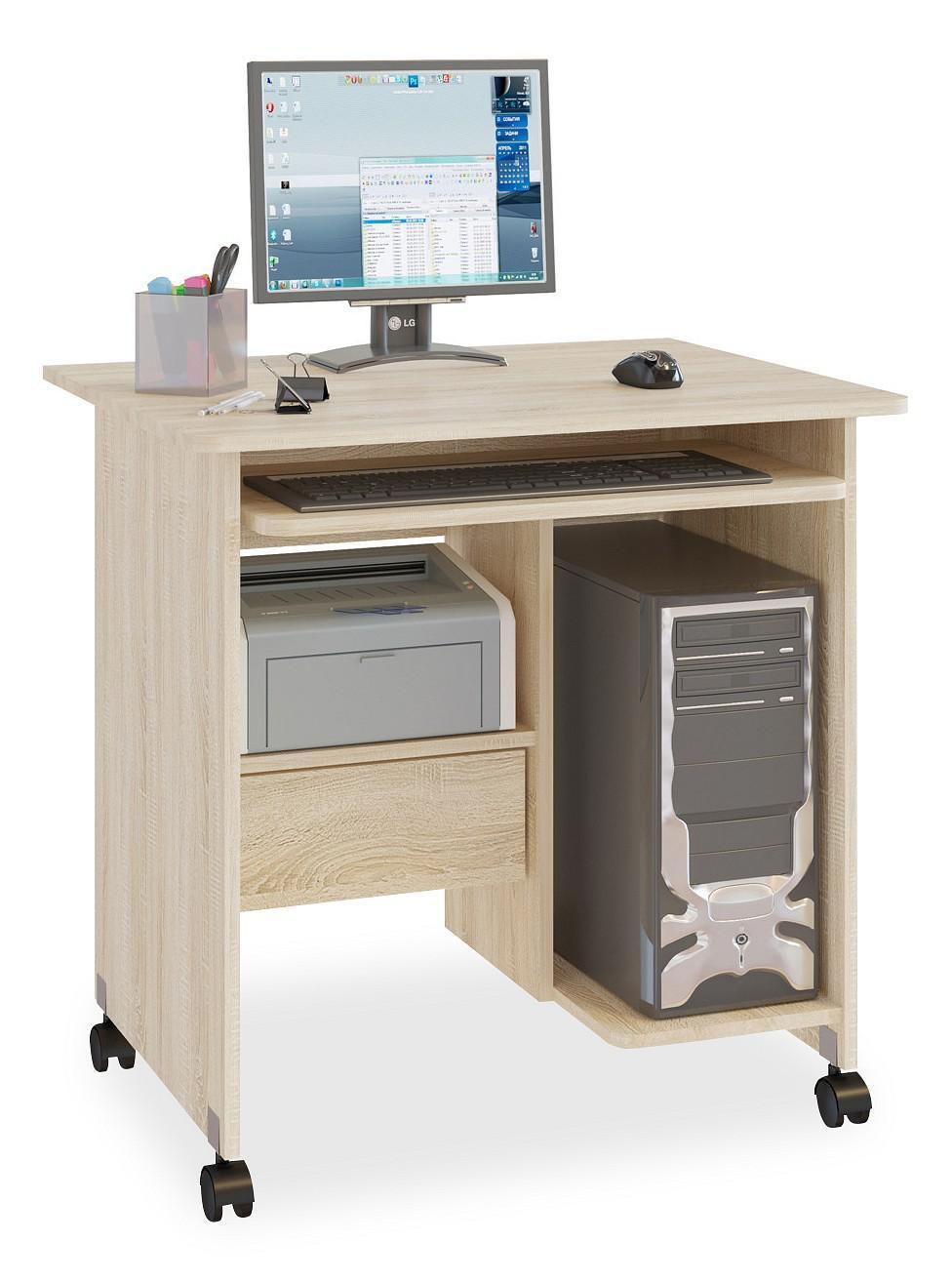 Компактный компьютерный стол на колесиках подойдет для работы как за ноутбуком, так и за полноценным компьютером. На внутренних полочках можно удобно расположить системный блок и даже небольшой принтер. Под полкой находится выдвижной ящик. Под столешницей располагается полочка под клавиатуру.