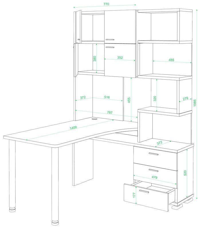 стеллаж:3 ящика,4 дверцы,6 полок