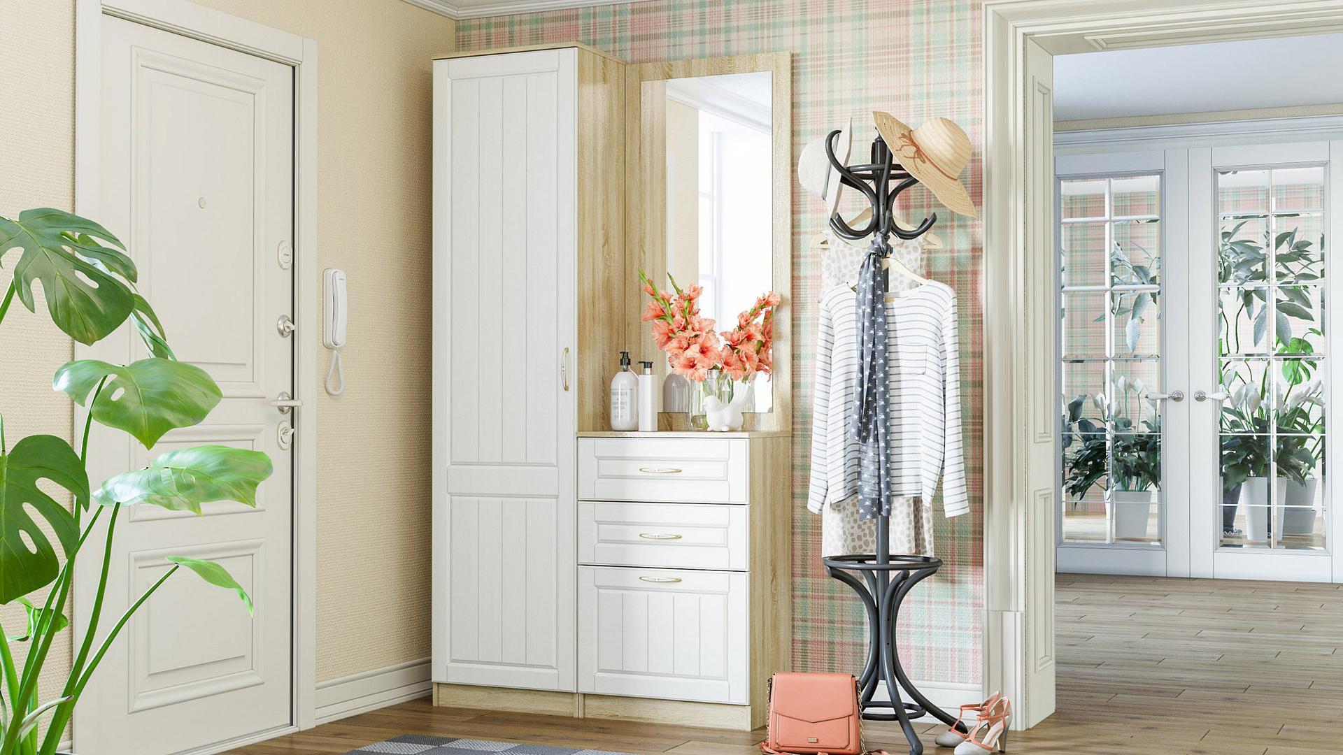 Стенка для прихожей Оливия SLV_Oliviya_system_5 создана популярным производителем мебели Сильва. Она входит в серию «Оливия» и изготовлена в соответствии с общепринятыми стандартами качества. Предлагаемая рыночная цена за данную комплектацию составляет 18870 руб. Матовый корпус изготовлен из износостойкого материала (ЛДСП Е1), отличающегося долговечностью и практичностью, а его оттенок («дуб сонома») оптимально сочетается с расцветкой и фактурой фасада (МДФ, цвет «дерево белое»). Стенка для прихожей Оливия включает в себя следующие компоненты: зеркало настенное: 602x20x1254 мм, тумба для обуви: 602x380x928 мм, шкаф платяной: 452x380x2198 мм. Желаем приятных покупок на нашем сайте!