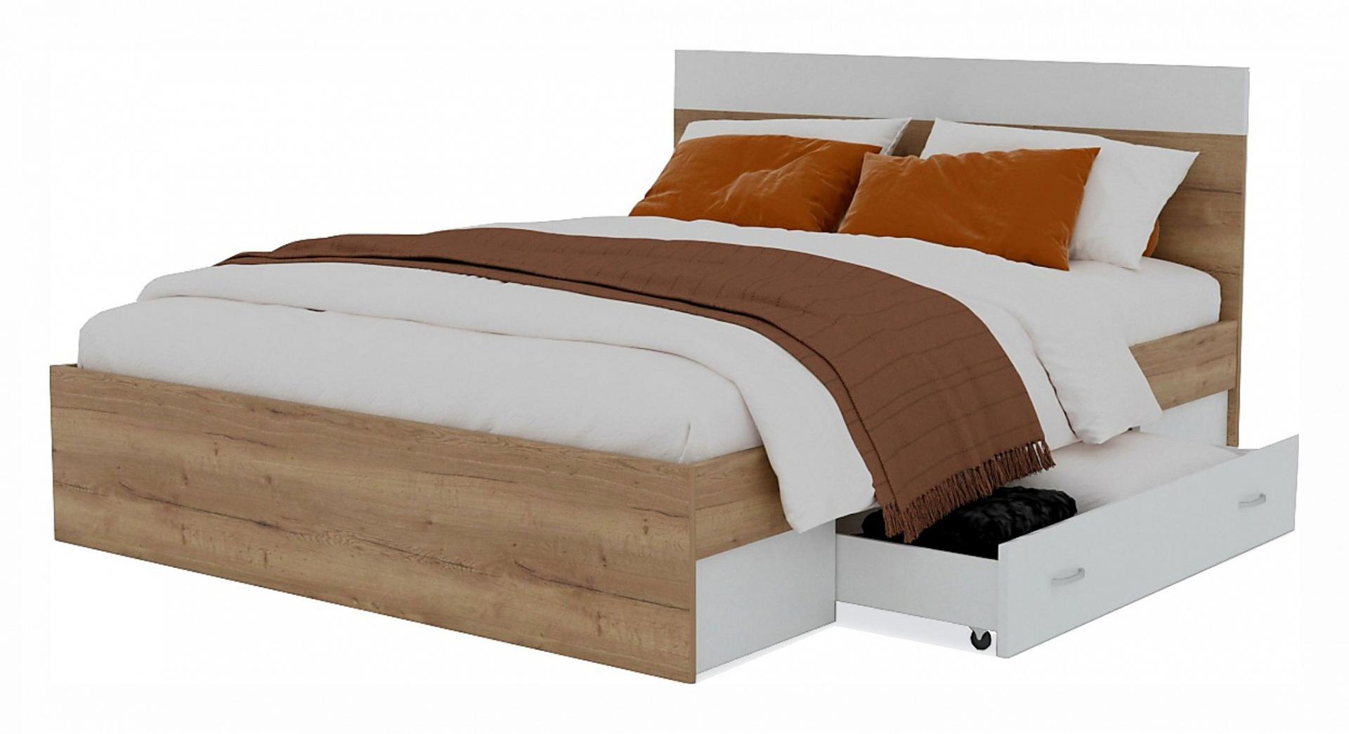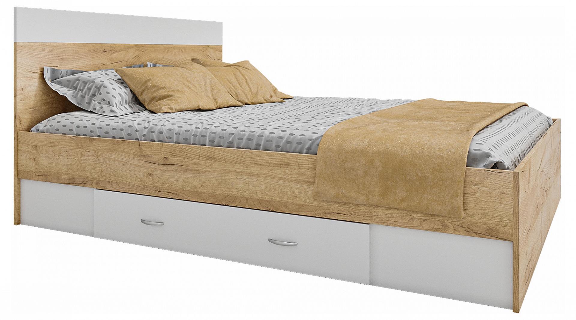 Изголовье кровати выполнено с сочетанием двух текстур – дуб золотой и белый.