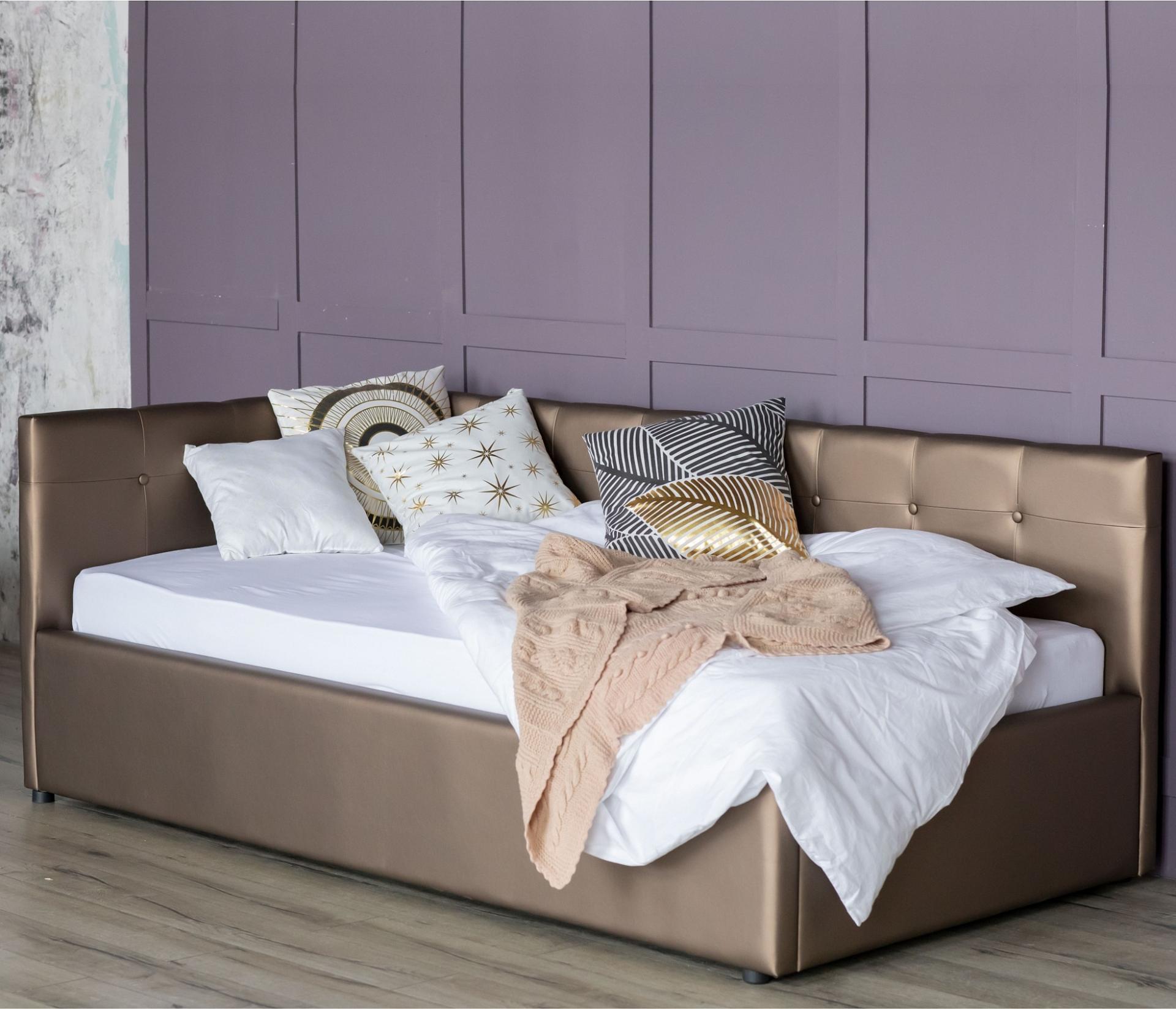 Интерьерная кровать-тахта имеет усиленное металлическое основание с амортизирующими ортопедическими ламелями.