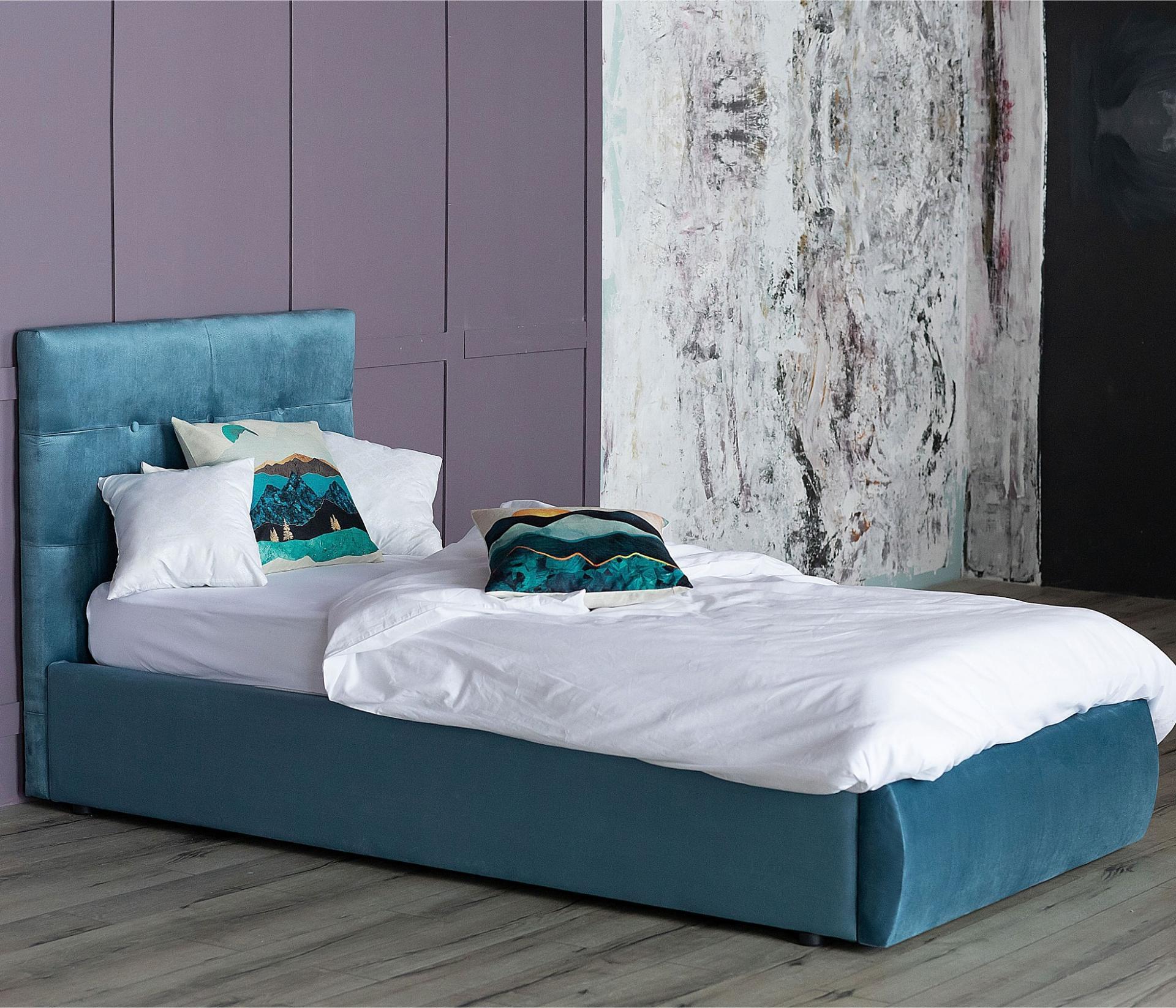 Спинка кровати мягкая, рельефная с неглубокими стяжками и декоративными пуговицами. Обивка изголовья и периметра кровати выполнена из велюра. Задняя стенка обшита спанбондом.