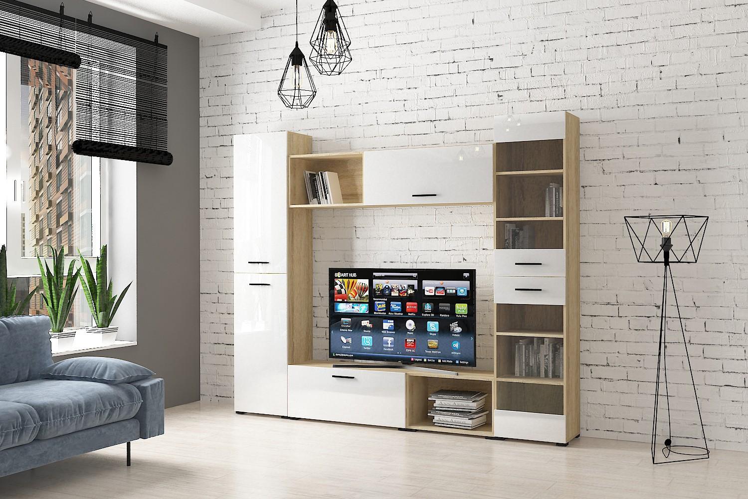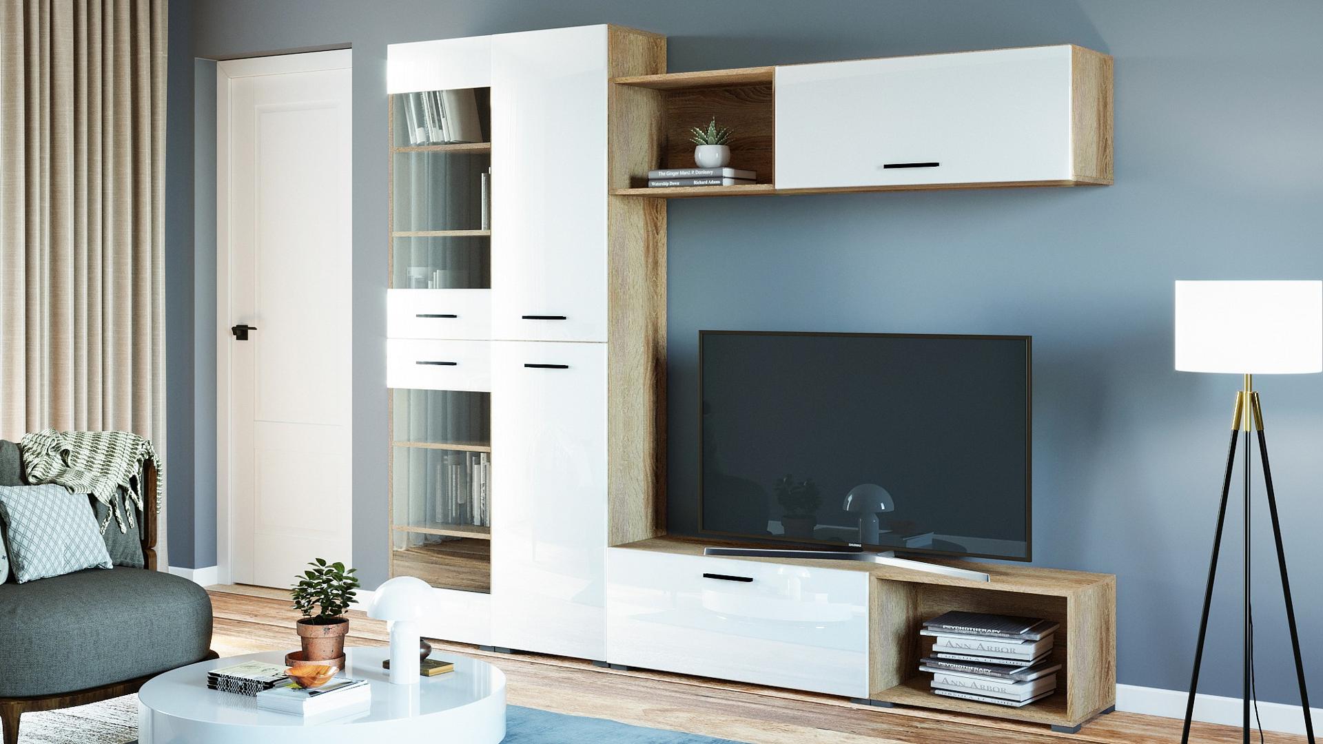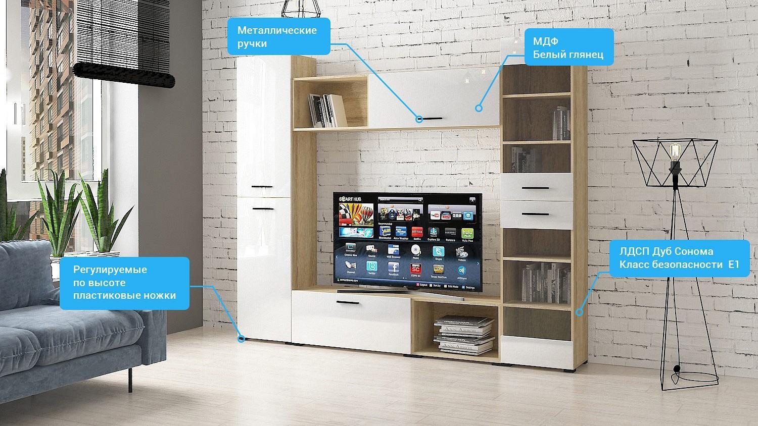 Гостиная сделана из ЛДСП класса Е1 ведущего европейского производителя, фасады из экологичного МДФ, покрыты ПВХ глянцевой пленкой.