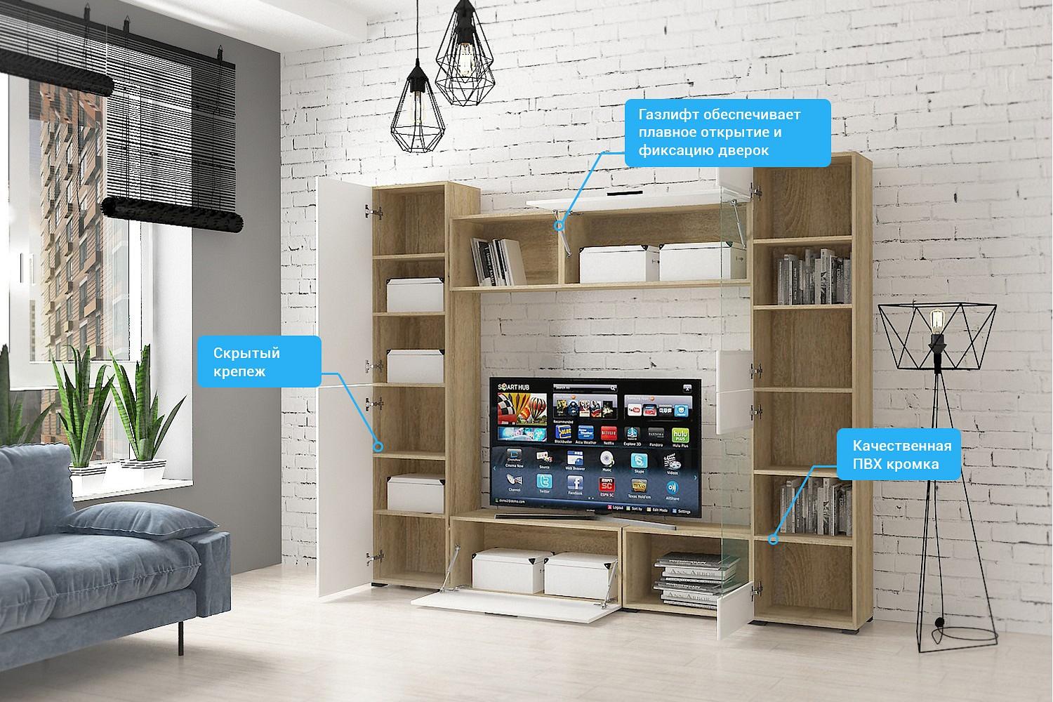 На всех внешних торцах гостиной кромки ПВХ, что обеспечивает безупречный внешний вид и долговечность. Металлические мебельные ручки прочны и надежны, со временем не изменят свой внешний вид.