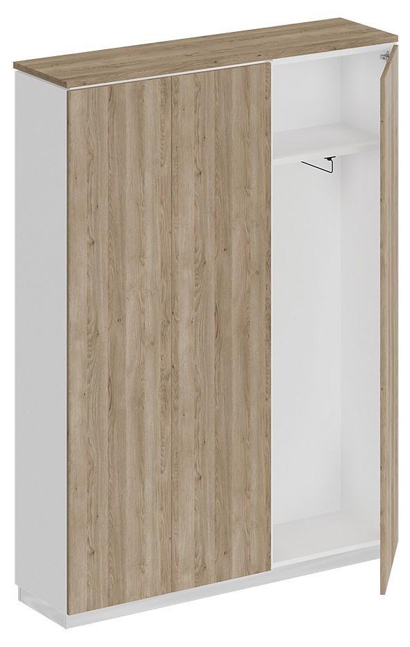 Шкаф состоит из шкафа для документов, узкого шкафа для одежды под общим топом и цоколя на 2 шкафа.