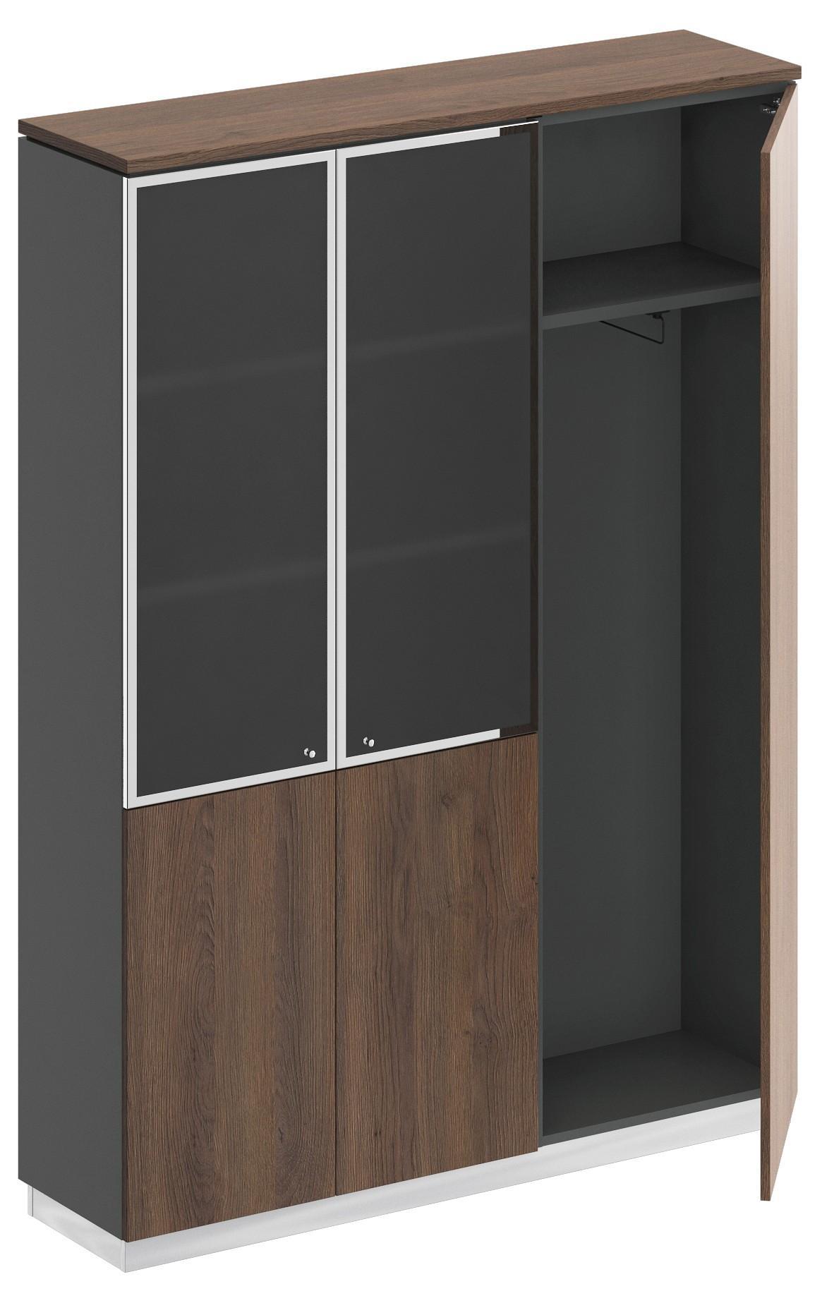 Шкаф состоит из шкафа для документов со стеклом, узкого шкафа для одежды под общим топом и цоколя на 2 шкафа.