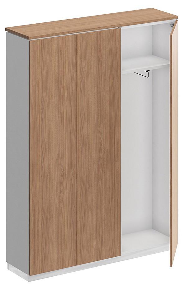 Шкаф состоит из шкафа для документов, узкого шкафа для одежды под общим топом и цоколя на 2 шкафа.