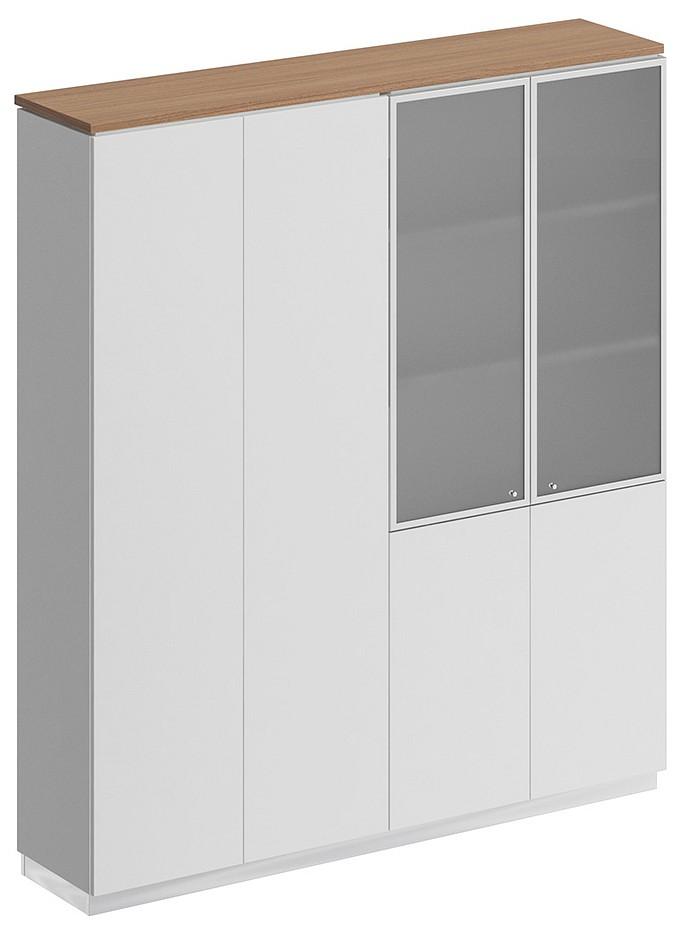 Шкаф состоит из шкафа для документов со стеклом и закрытого шкафа для документов под общим топом, цоколя и дверей.