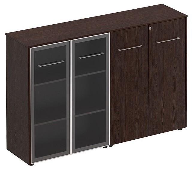 Тумба-витрина состоит из шкафа со стеклом для документов и закрытого шкафа для документов под общим топом.