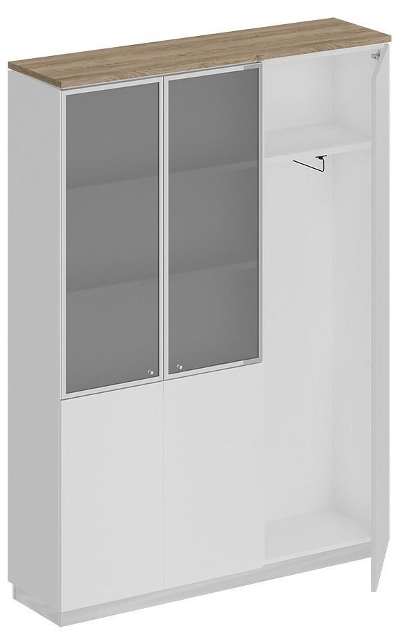 Шкаф состоит из шкафа для документов со стеклом, узкого шкафа для одежды под общим топом и цоколя на 2 шкафа.