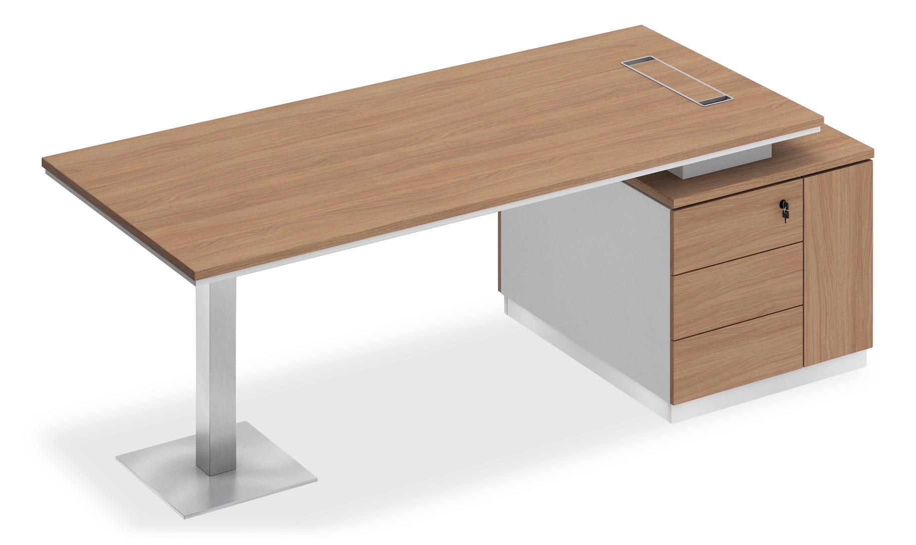 Стол состоит из столешницы, заглушки кабель-канала, металлической опоры и опорной тумбы.