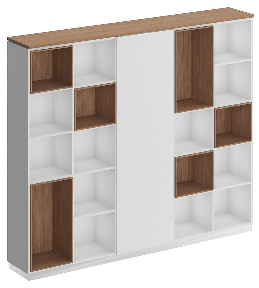 Шкаф комбинированный является стенкой из двух стеллажей и узкого шкафа для одежды под общим топом. Декоративный зазор между топом и боковыми стенками стеллажей является дизайнерским решением.
