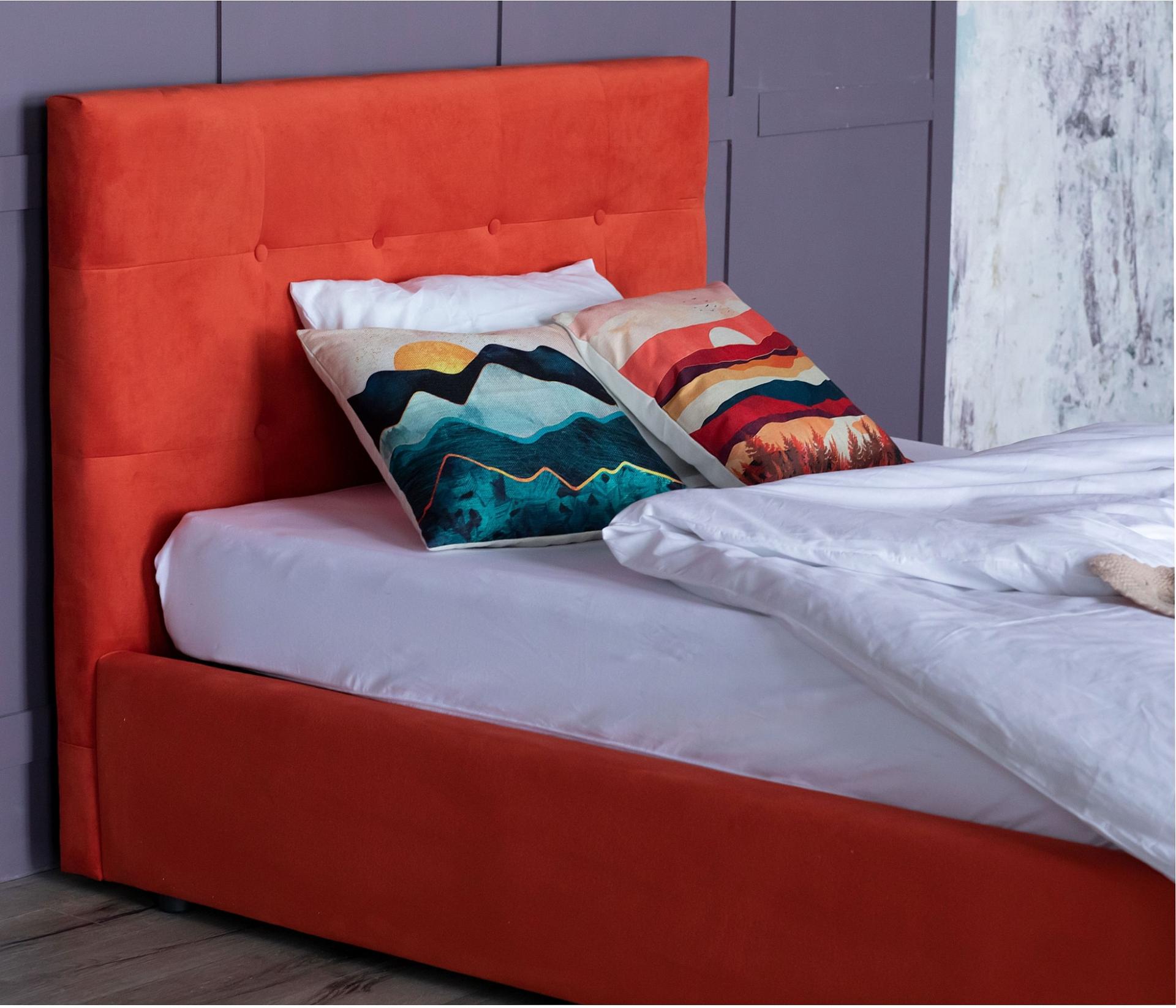 Спинка кровати мягкая, рельефная с неглубокими стяжками и декоративными пуговицами. Обивка изголовья и периметра кровати выполнена из велюра. Задняя стенка обшита спанбондом.