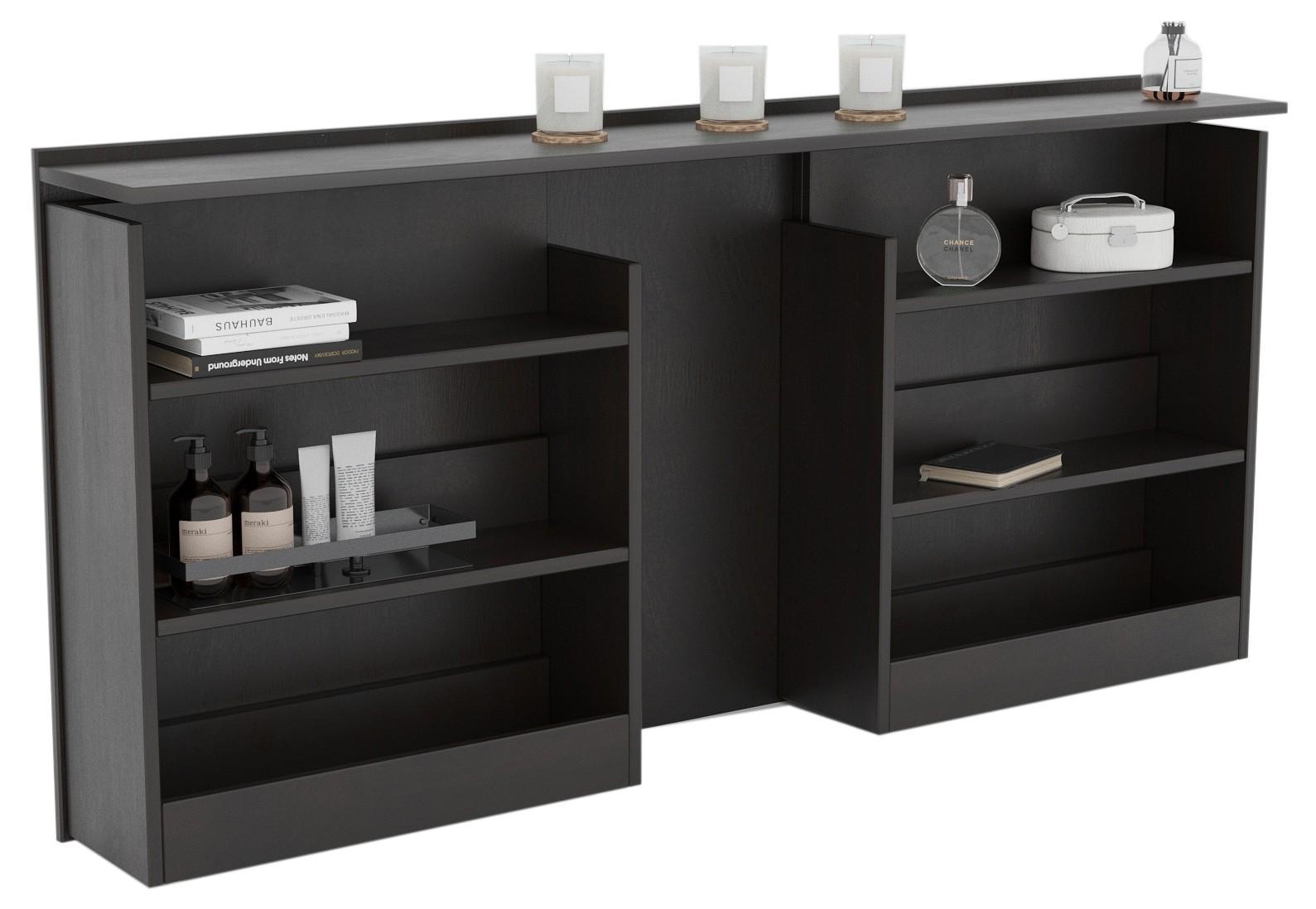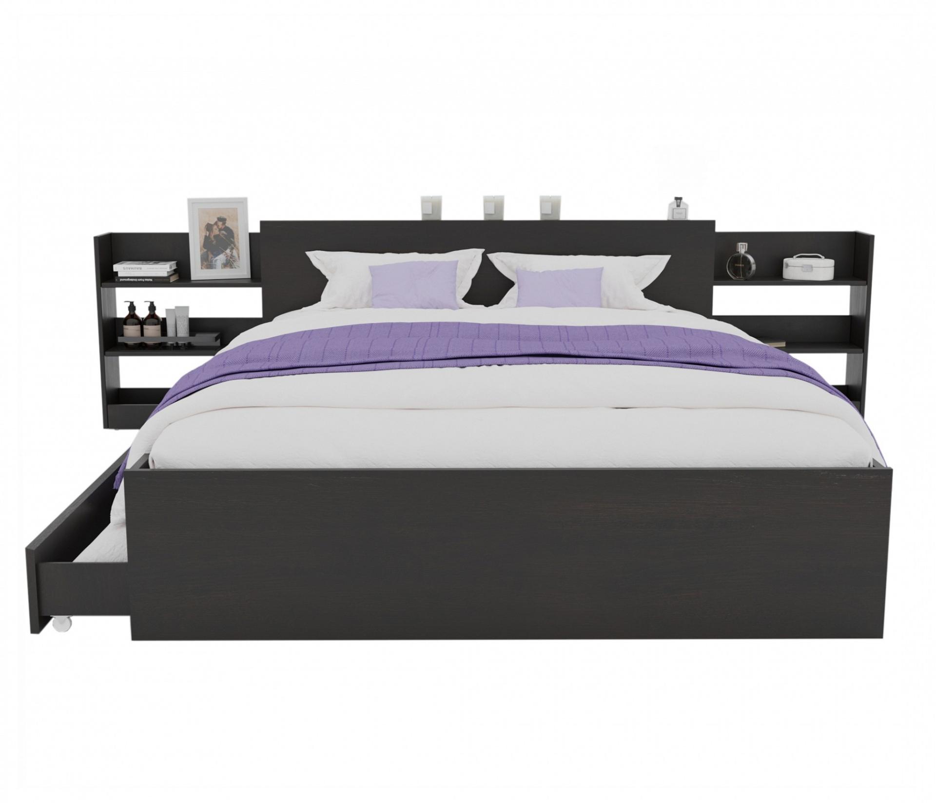 Выдвижные блоки расположены в изголовье кровати. Горизонтальные полки в блоках позволяют разместить необходимые вещи.