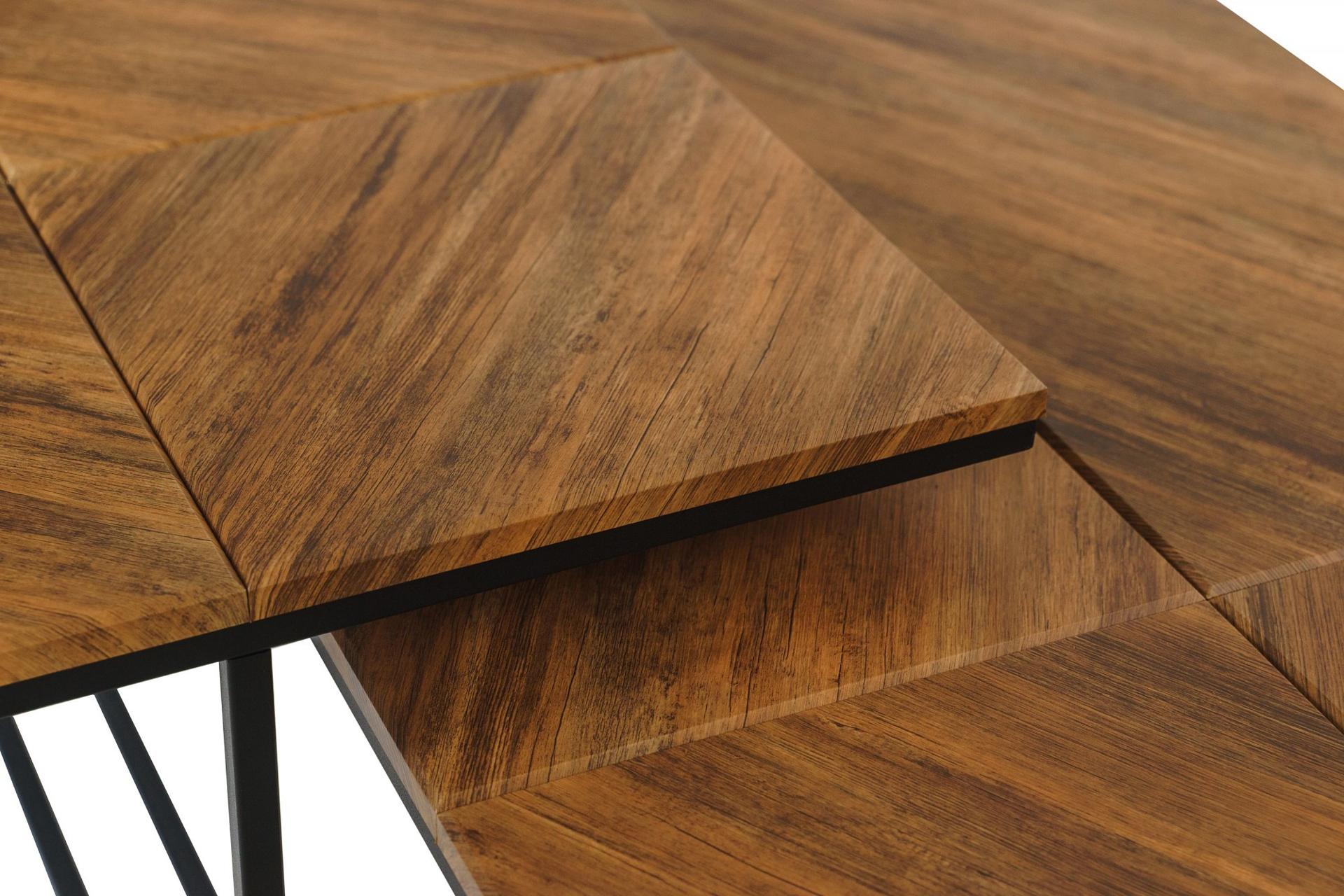 Оригинальность столу Эклектик придает дизайн столешницы с необычным направлением текстуры пленки американского дуба. Лаконичность форм и практичность исполнения столика безусловно будет залогом отличного дизайнерского оформления гостиной.