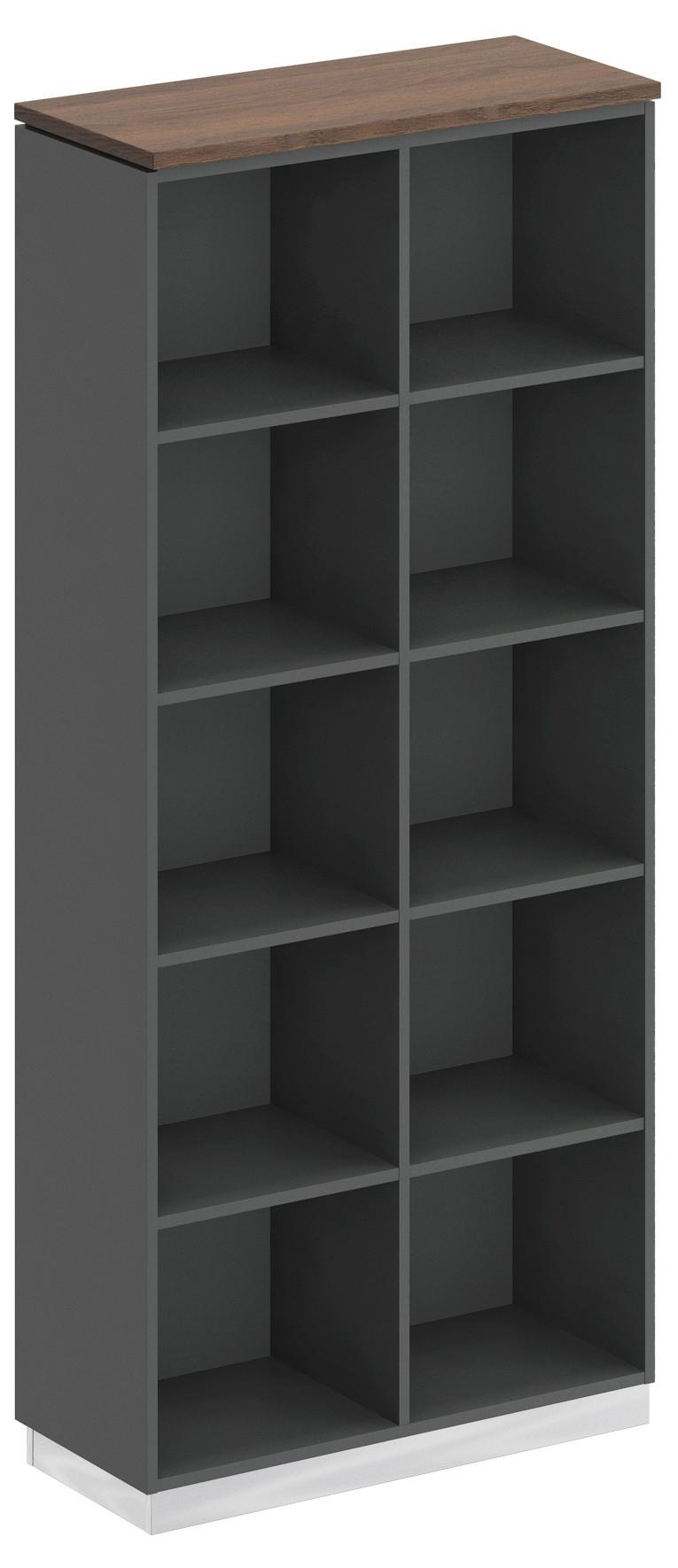 Стеллаж состоит из каркаса с полками, цоколя, топа и двух декоративных вставок.