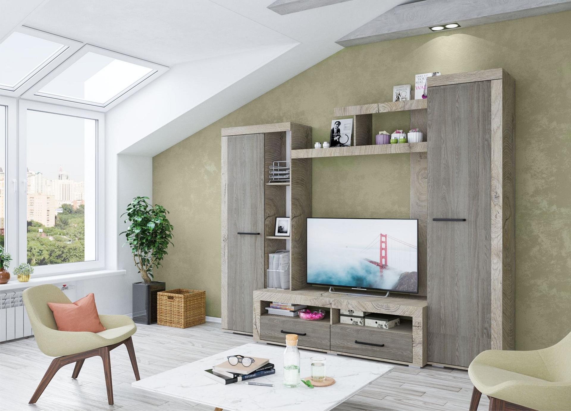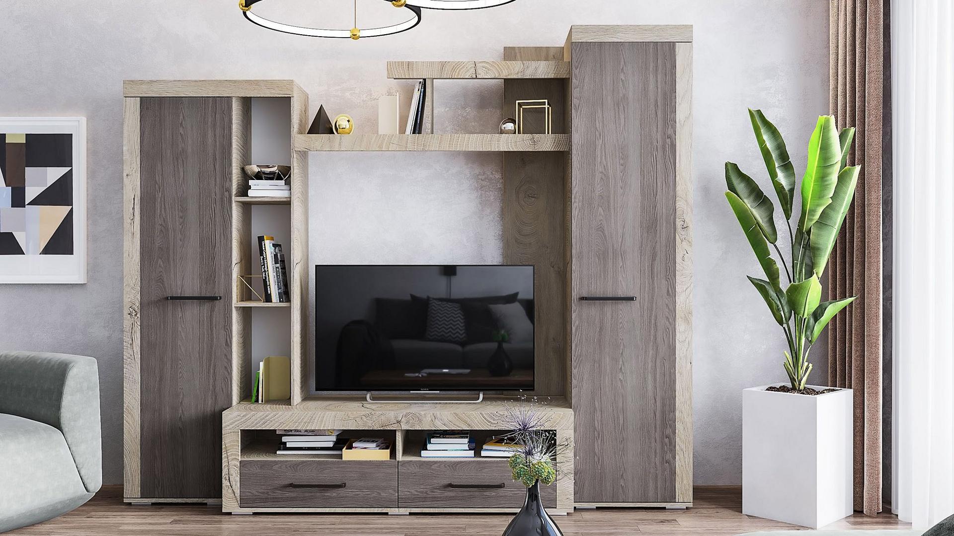 Ее вместительные модули и открытые полки предоставляют достаточно пространства для хранения и помогают соблюдать порядок, а ультрамодное сочетание цветов в оформлении придает гостиной особый стиль.
