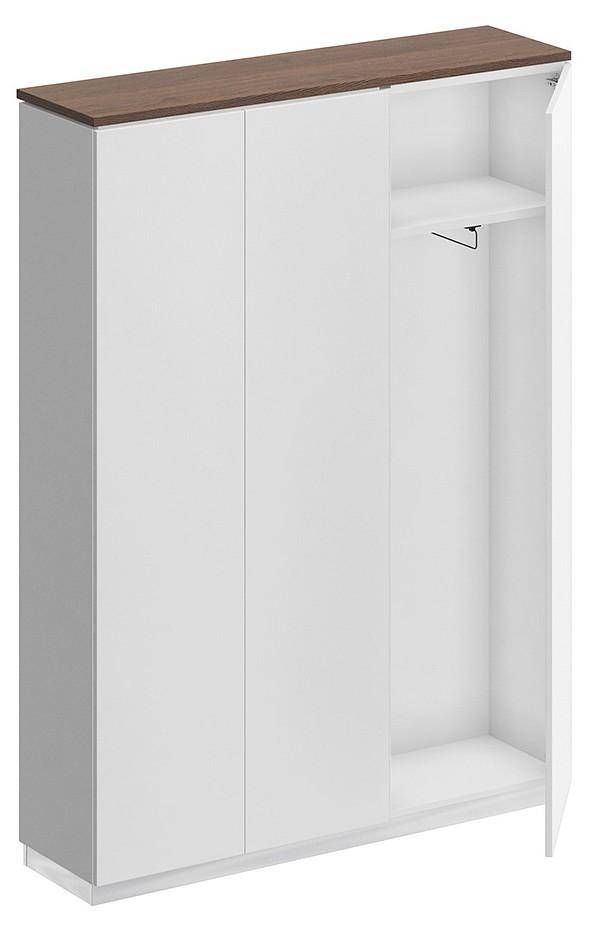 Шкаф состоит из шкафа для документов, узкого шкафа для одежды под общим топом и цоколя на 2 шкафа.