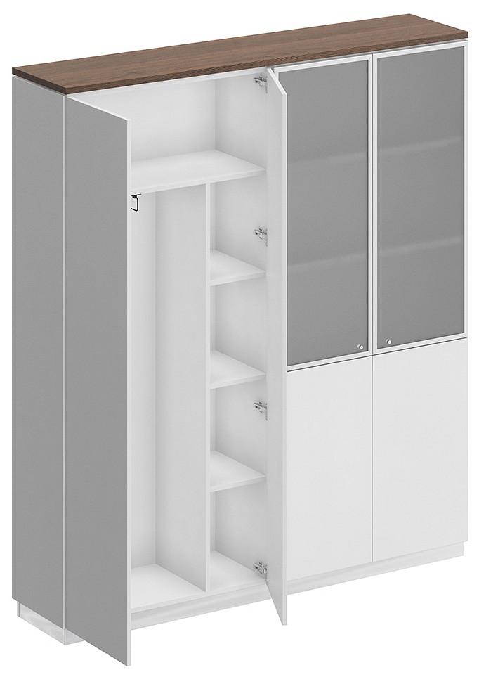 Шкаф состоит из шкафа для документов со стеклом и шкафа для одежды с дополнением под общим топом, цоколя на 2 шкафа и дверей.