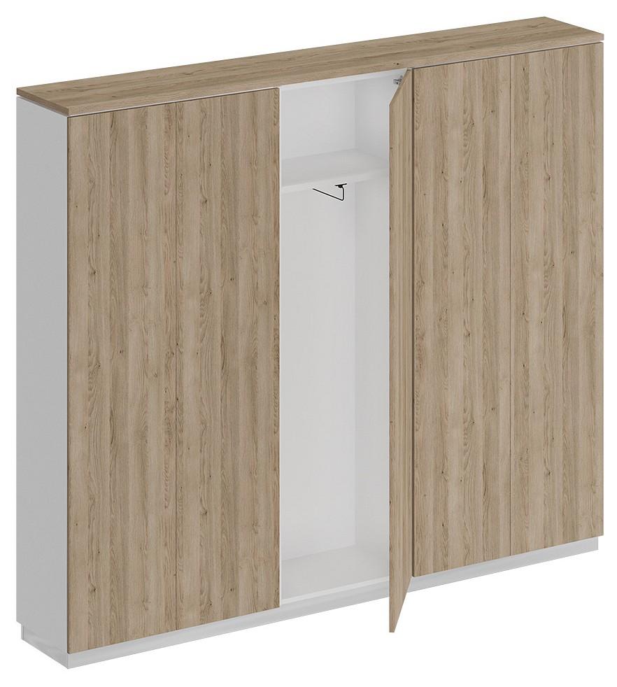 Дизайнерским решением является зазор 8 мм между топом и боковыми стенками корпусом шкафа. Проемы между полками обеспечивают размещение стандартных папок CORONA высотой 320 мм. Шкаф для одежды укомплектован фиксированной по высоте полкой под головные уборы и выдвижной штангой для одежды. Конструктив шкафа для одежды позволяет установить дверь в левом/правом положении. Изделие укомплектовано пятью дверями из ЛДСП без замка с системой открывания Push To Open (без ручек).