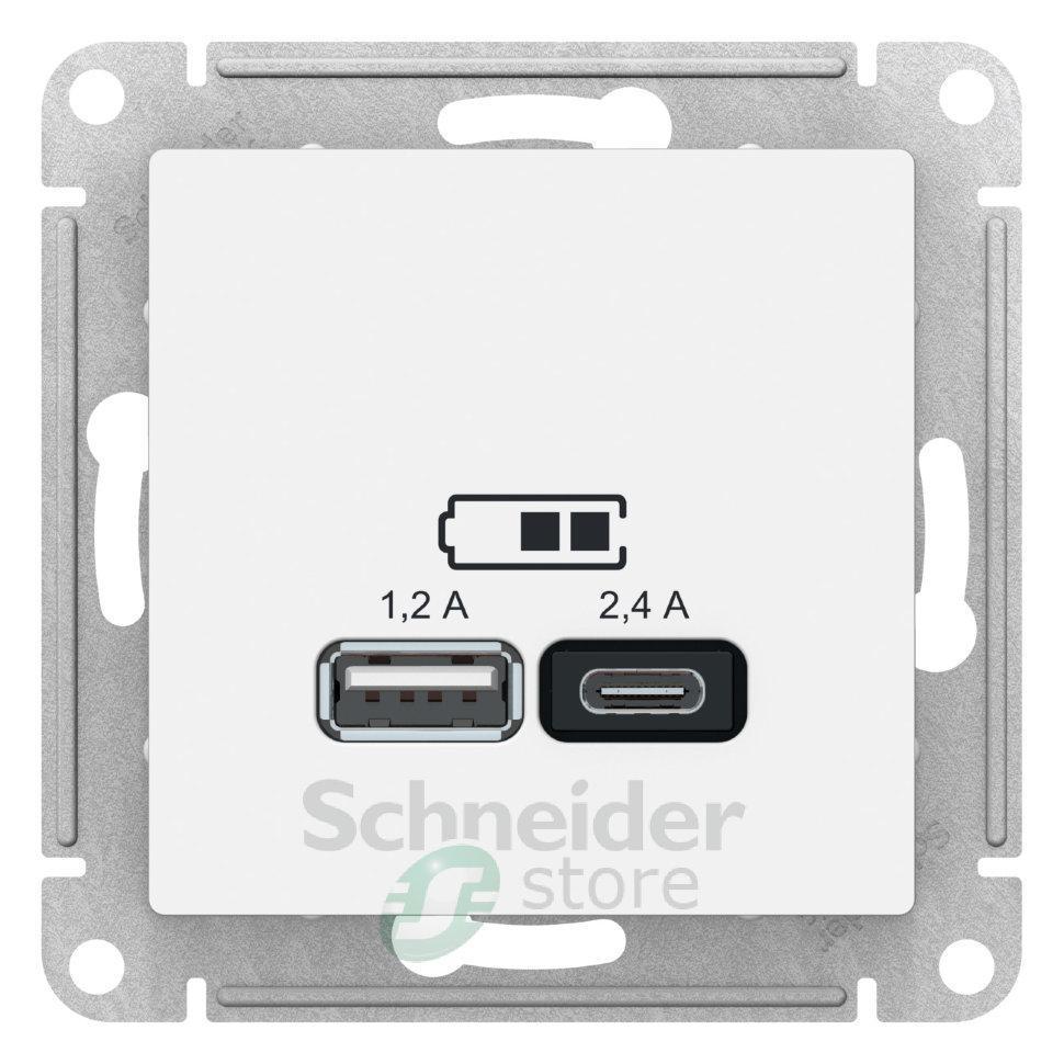 Розетка Schneider Electric AtlasDesign (цвет белый) двойная USB с разъемами типа A+C - Пластик с ионами серебра в белом цвете обеспечивает антибактериальный эффект. - Cовременная USB-зарядка с двумя разъемами позволяет заряжать как стандартные мобильные устройства через разъем типа А, так и новейшии устройства, в том числе ноутбуки, с разъемом типа С.
