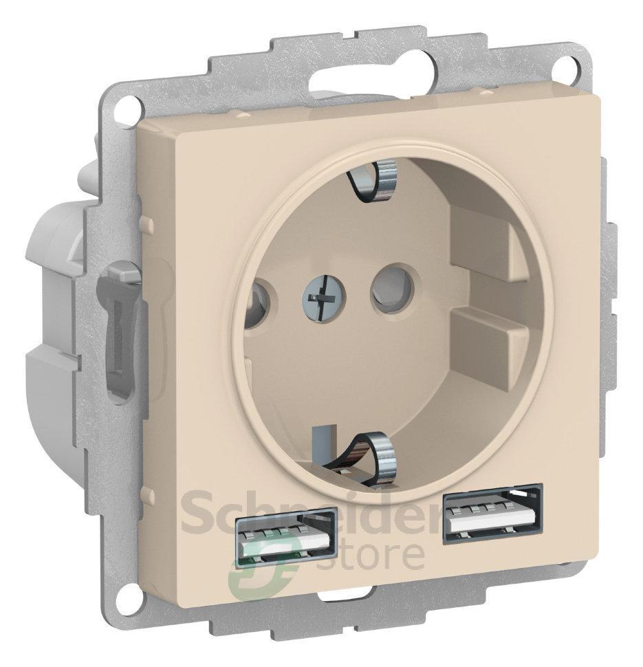 Розетка силовая Schneider Electric AtlasDesign 16А (цвет бежевый) с заземлением и шторками с розеткой USB, с друмя разъемами типа А - Лицевые детали из качественного ABS-пластика, устойчивого к царапинам и УФ-излучению. - Заземляющий контакт обеспечивает дополнительную защиту от удара электрическим током. - Шторки обеспечивают дополнительную безопасность в доме, где находятся дети. - Одно устройство позволяет как подключить бытовые приборы, так и зарядить мобильные устройства.