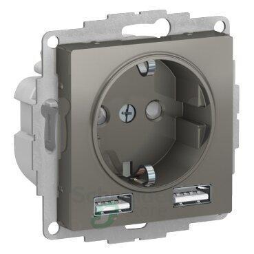 Розетка силовая Schneider Electric AtlasDesign 16А (цвет сталь) с заземлением и шторками с розеткой USB, с друмя разъемами типа А.