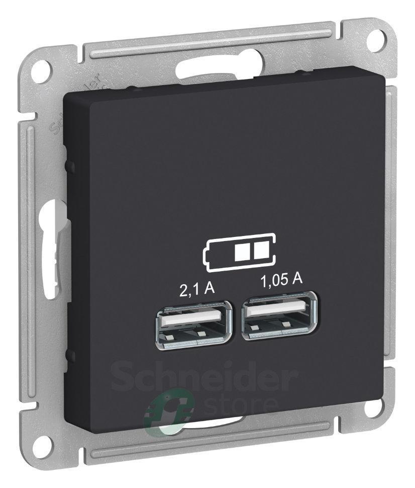 Механизм Schneider Electric AtlasDesign (цвет карбон) розетки для зарядки с двумя разъёмами USB с выходными напряжением 5 В постоянного тока и выходами с номинальным током по 2,1 А.