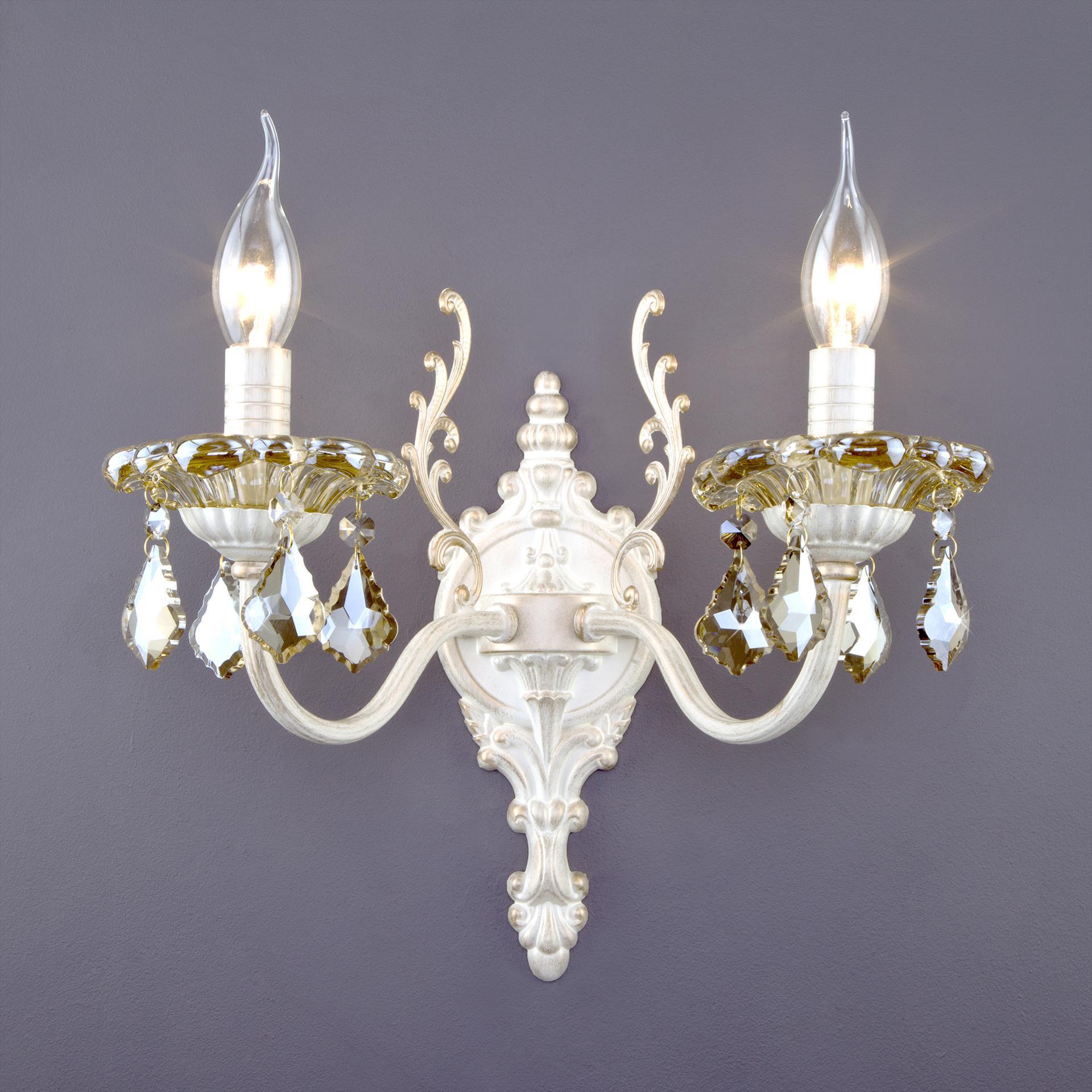 Бра с тонированным хрусталем 3281/2 белый с золотом / тонированный хрусталь двухрожковый станет ярким световым акцентом в классических интерьерах и создаст качественное освещение на площади 10 м². Эффектные чаши подсвечников украшены хрустальными подвесками, которые искрятся в лучах света, наполняя помещение выразительным блеском. В качестве источника света используются сменные лампы типа свеча на ветру с цоколем E14. Патрон рассчитан на максимальную мощность ламп накаливания 60 Вт. Корпус светильника выполнен из высококачественного и прочного металла с надежным покрытием. Бра легко устанавливается при помощи крепежной планки, которая обеспечивает надежную фиксацию светильника на стене. Классическое бра с легкими формами гармонично сочетается с хрустальными люстрами и станет отличным завершением композиции вашей гостиной или спальни. В интернет-магазине Минимир вы можете купить бра в классическом стиле с хрусталем с доставкой по Москве, Санкт-Петербургу и России.