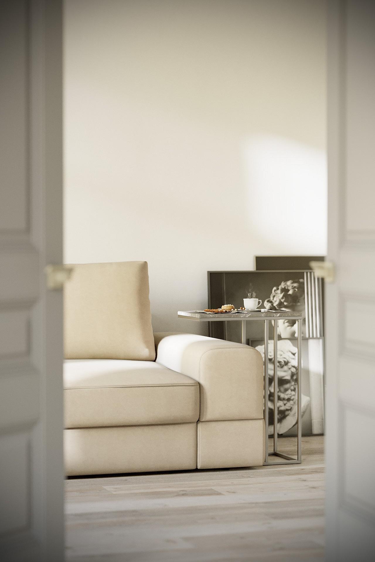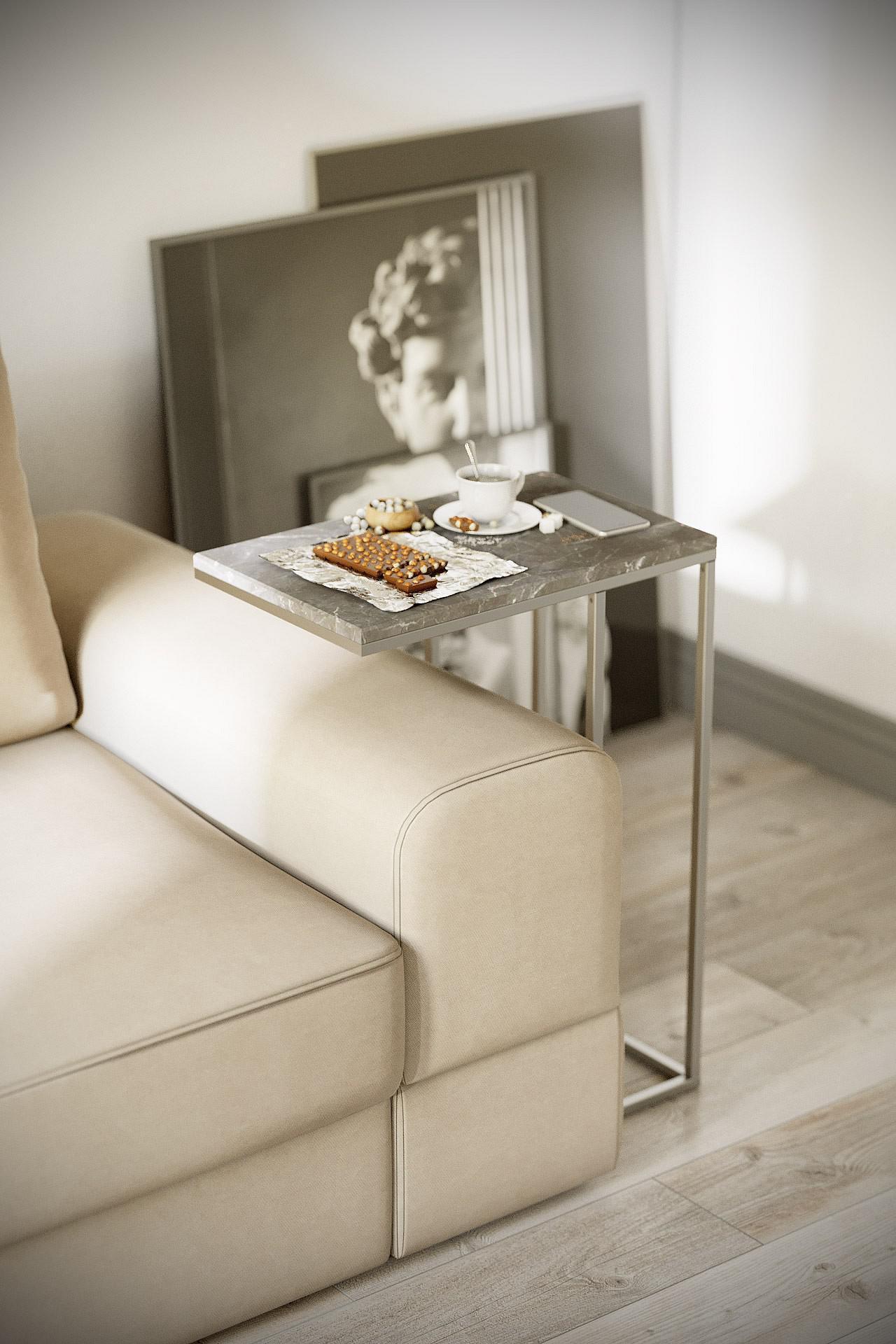 Конструкция столика Агами позволяет расположить столешницу прямо над диваном или боковиной дивана, что достаточно удобно и функционально. Данный предмет мебели в декоре лофт будет отличаться лаконичной простотой, без излишеств.