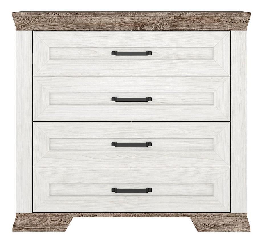 Мелочи создают общее настроение в интерьере, особенно, если лежат не на своем месте. Справиться с этой задачей поможет комод Marselle KOM4S , сделанный популярным брендом BlackRedWhite. Производитель предлагает следующую комплектацию: 4 ящика. Матовый корпус выполнен в благородном оттенке «дуб сонома темный, ясень снежный», тонко перекликающимся с расцветкой фасада (ясень снежный), изготовленного из МДФ. Благодаря оптимальным размерам комода (изделие длиной 900 мм, шириной 980 мм и выступом 455 мм), вы сможете разместить в нем все необходимое, при этом сохранив полезное пространство в комнате.