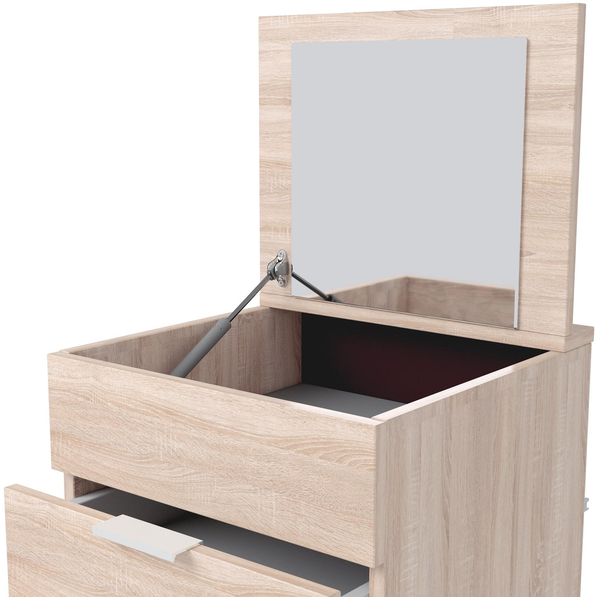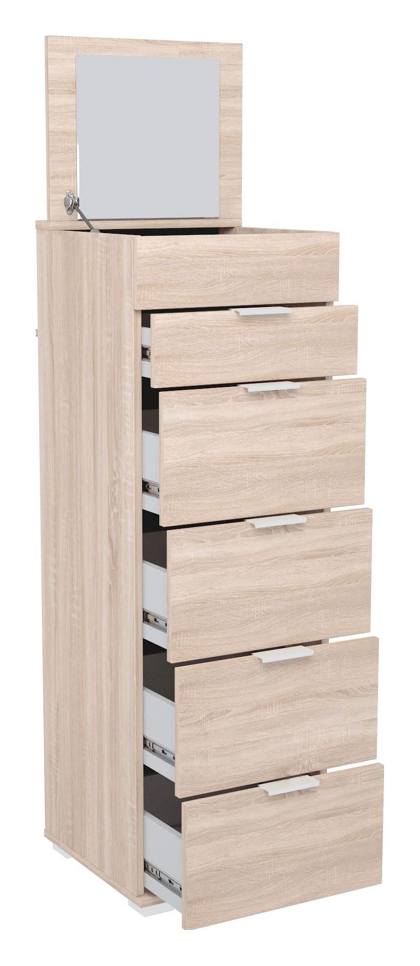 Комод Наоми-6 оснащен пятью выдвижными ящиками и отсеком с откидной крышкой с амортизатором для фиксации. Откидная крышка c зеркалом. Комод очень удобен, так как не занимает много места и совмещает в себе функции комода и трюмо.