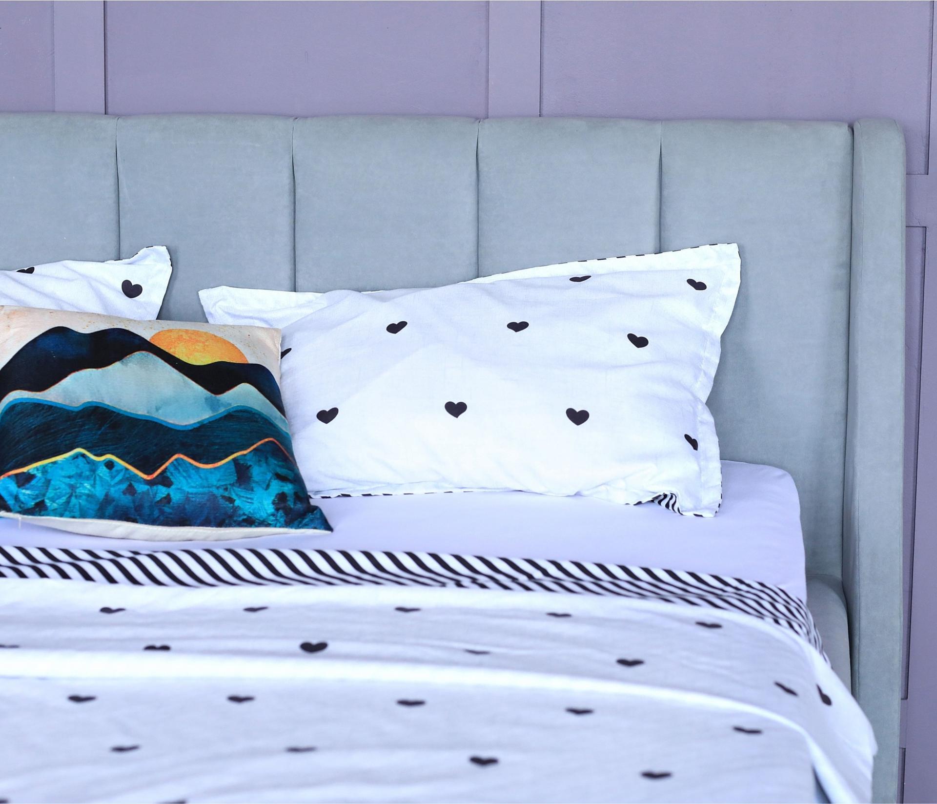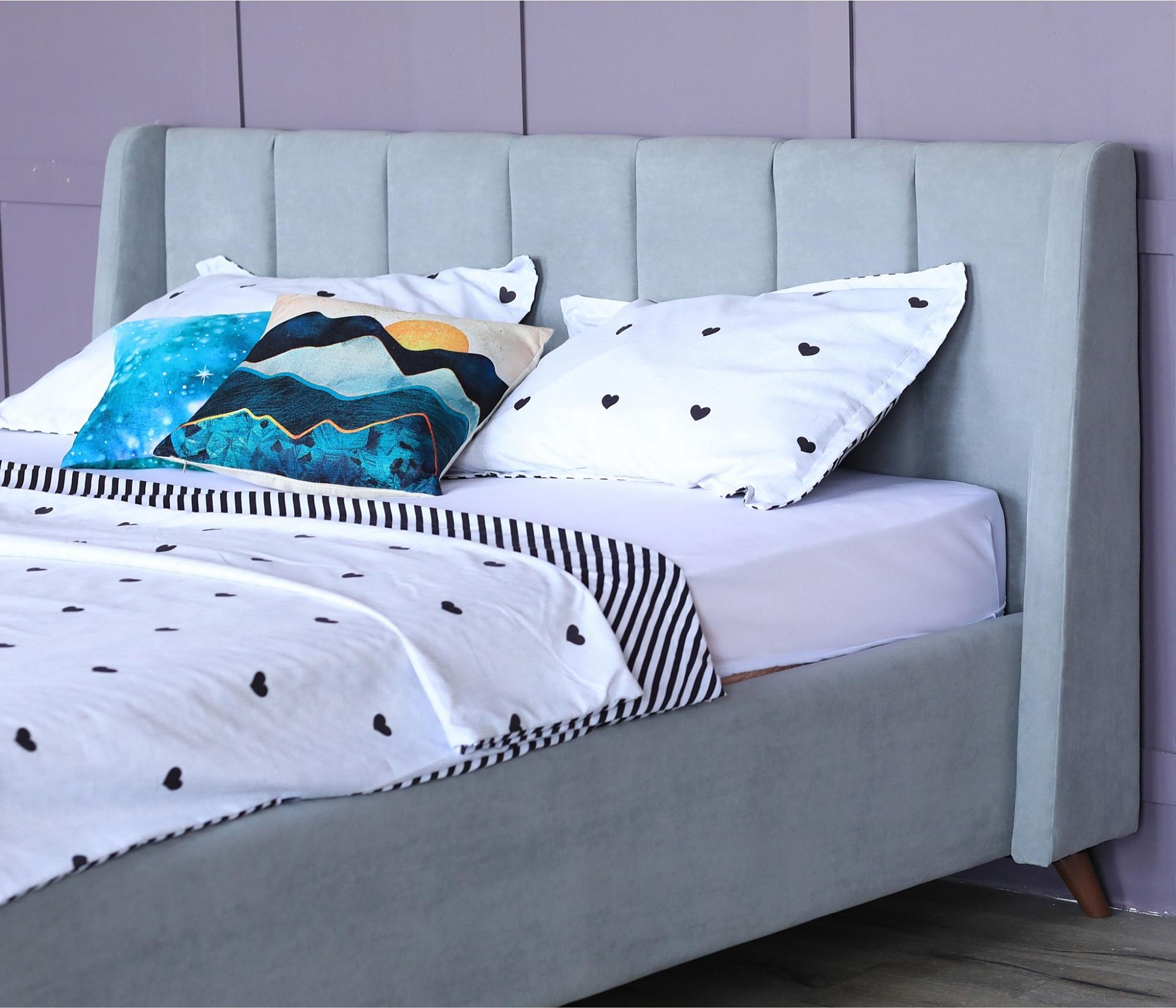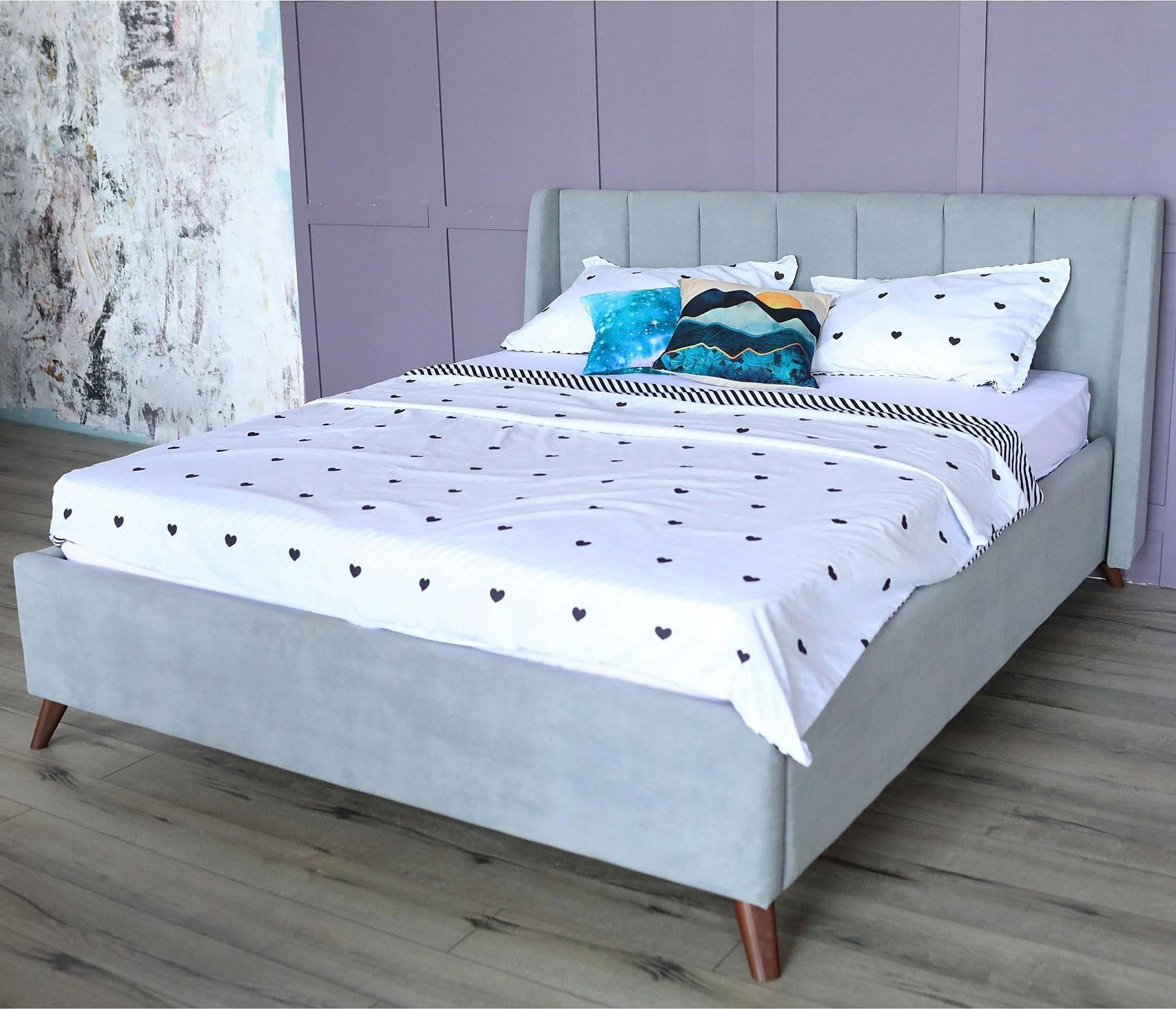 Кровать имеет рельефную мягкую спинку с неглубокими стяжками, которые придают особую изысканность изголовью. Обивка изголовья и весь периметр кровати выполнен из мебельной ткани – велюр. Ткань износостойкая, легко чиститься от загрязнений, практичная, эластичная, устойчивая к ультрафиолету.