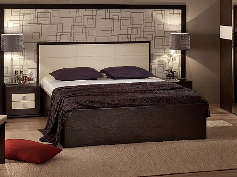 Необычное высокое изголовье со вставками из светлой винил-кожи придает шарм всей конструкции.