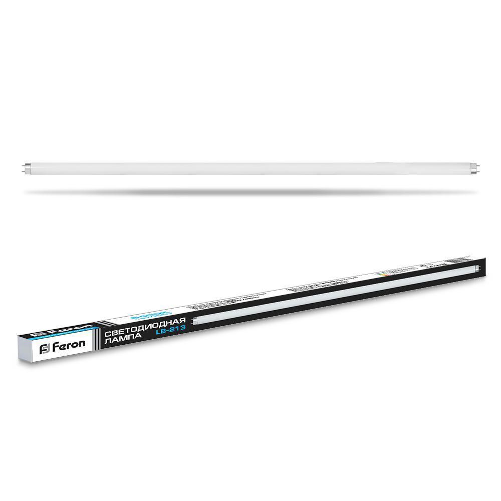 Лампа светодиодная FERON LB-213, T8 (линейная двухцокольная), 18W 230V G13 6400К (дневной), рассеиватель матовый белый, 1650Lm, угол рассеивания 270°, корпус стекло, 1200*26мм