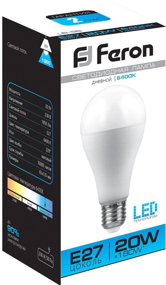 Лампа светодиодная FERON LB-98, A65 (шар), 20W 230V E27 6400К (дневной), рассеиватель матовый белый, 1850Lm, угол рассеивания 220°, 135*65мм