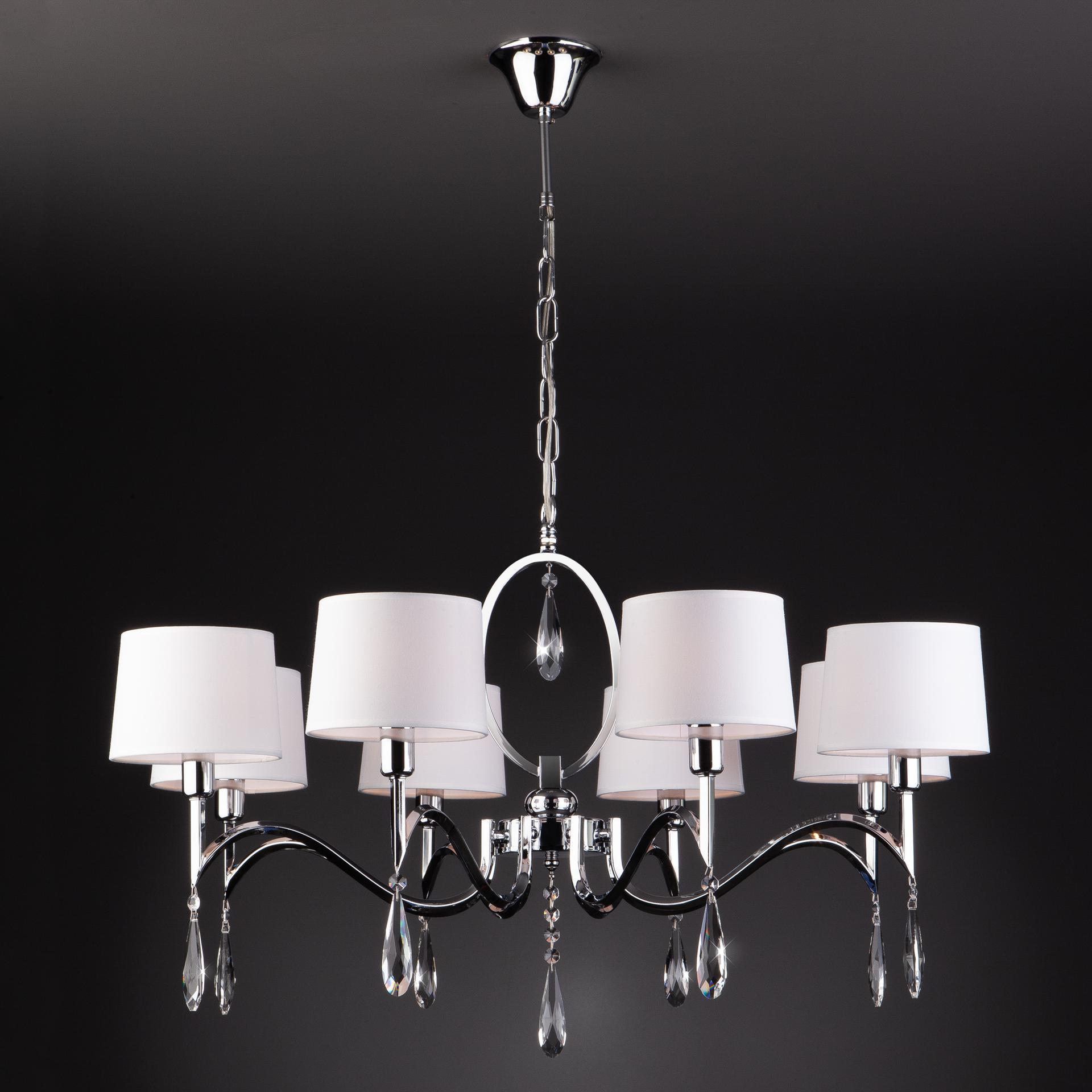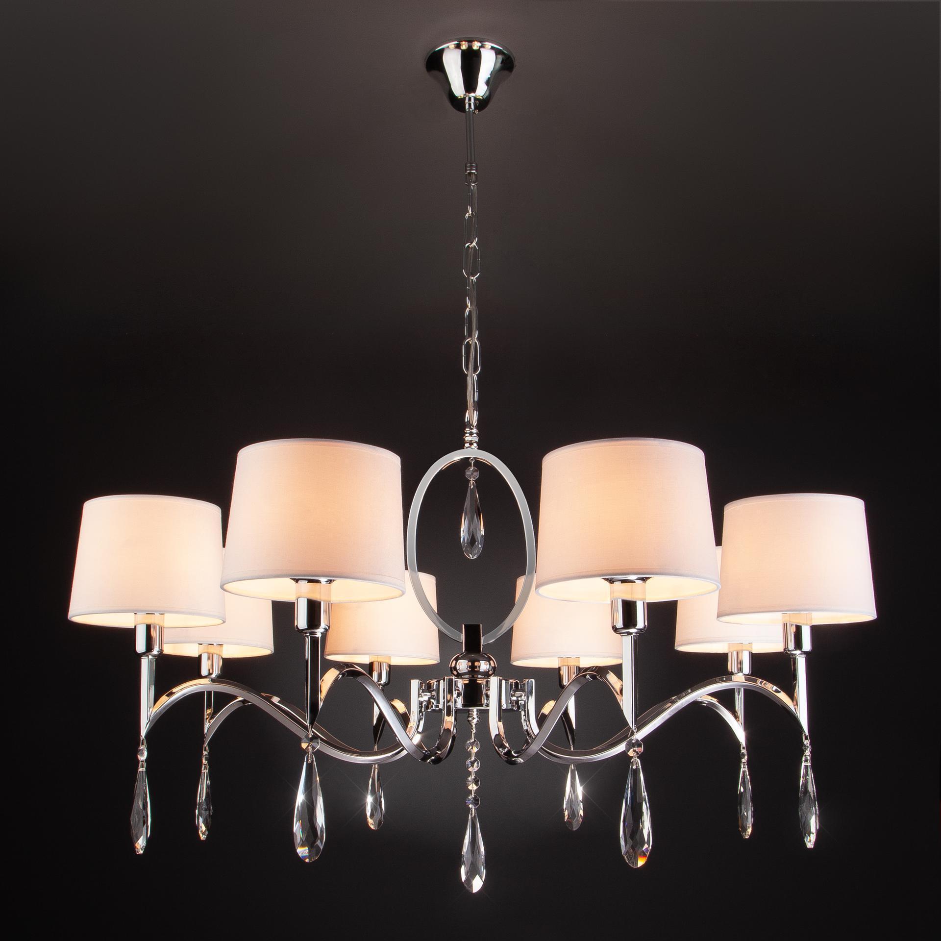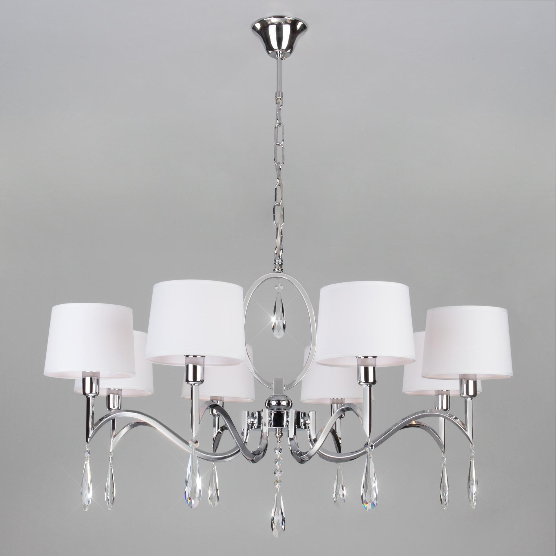 Люстра с хрусталем и абажурами 10093/8 хром/прозрачный хрусталь Strotskis предназначена для создания основного освещения в современных и классических интерьерах, подходит для различных типов помещений: гостиная, спальня и рассчитана на площадь освещения 25м². Классическая люстра оснащена патронами с цоколем Е14, которые рассчитаны на максимальную мощность ламп 40 Вт. Люстра украшена эффектным декором из хрусталя и дополнена выразительными тканевыми абажурами. Арматура изготовлена из высококачественного металла с надежным защитным покрытием. В нашем интернет-магазине вы можете купить подвесную люстру по выгодной цене.