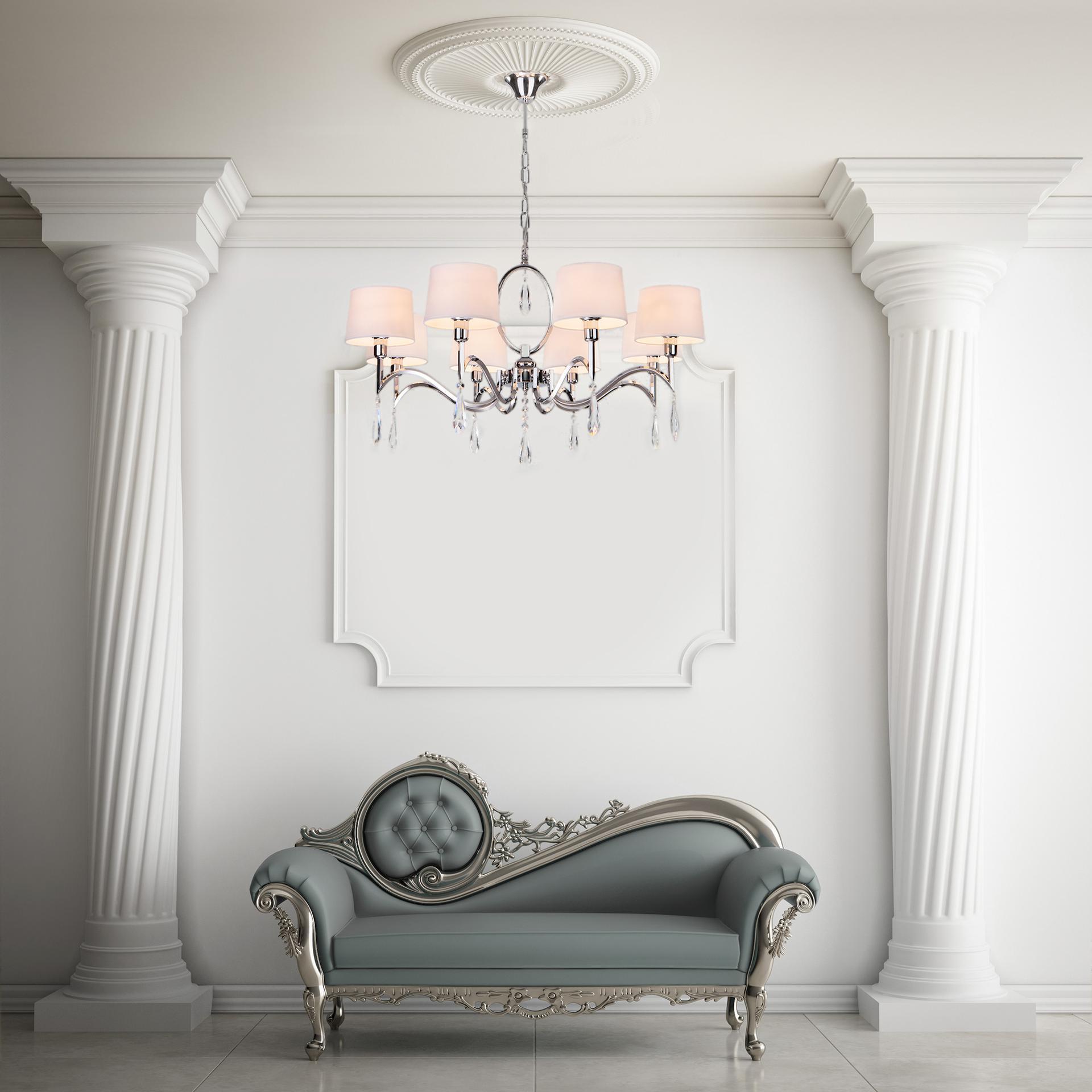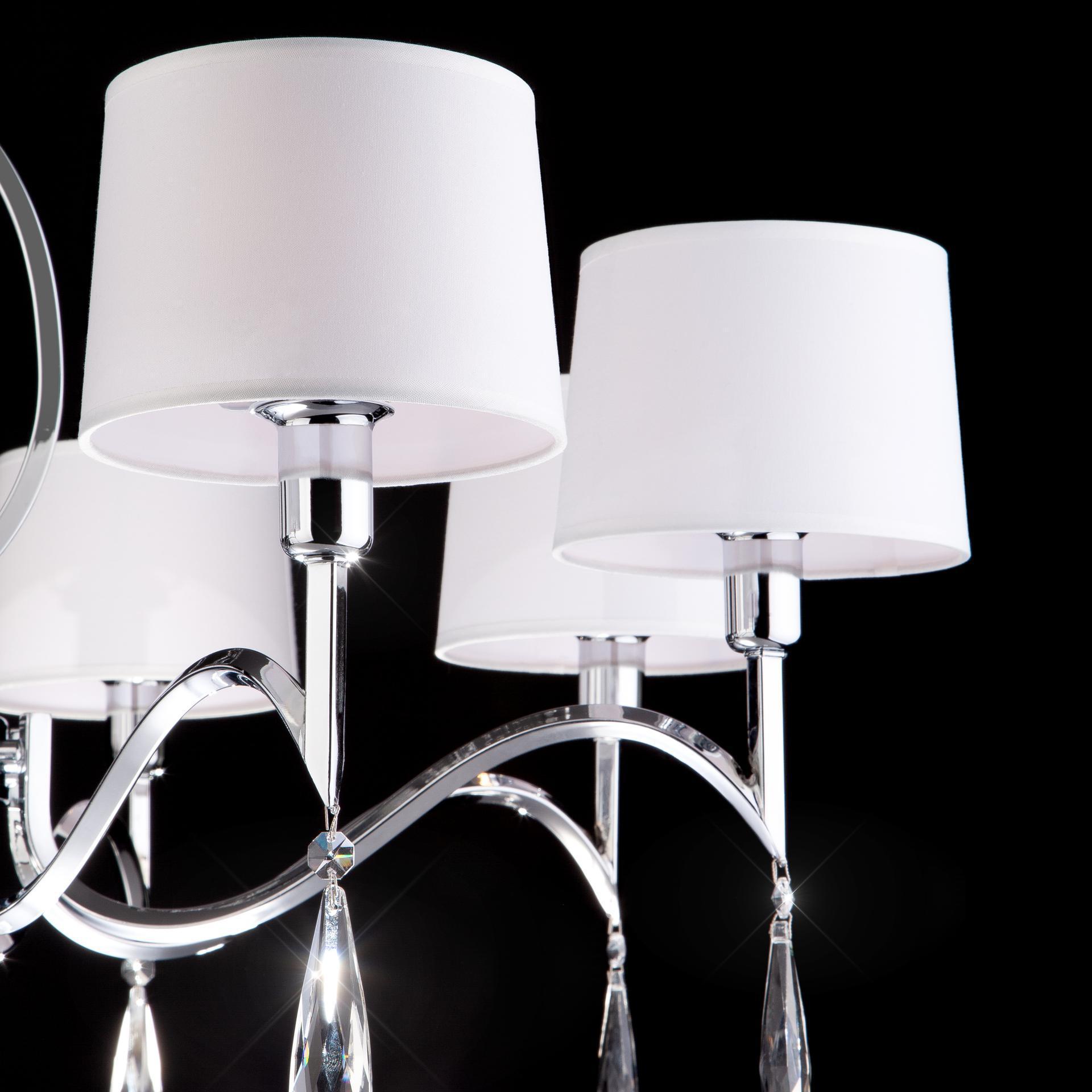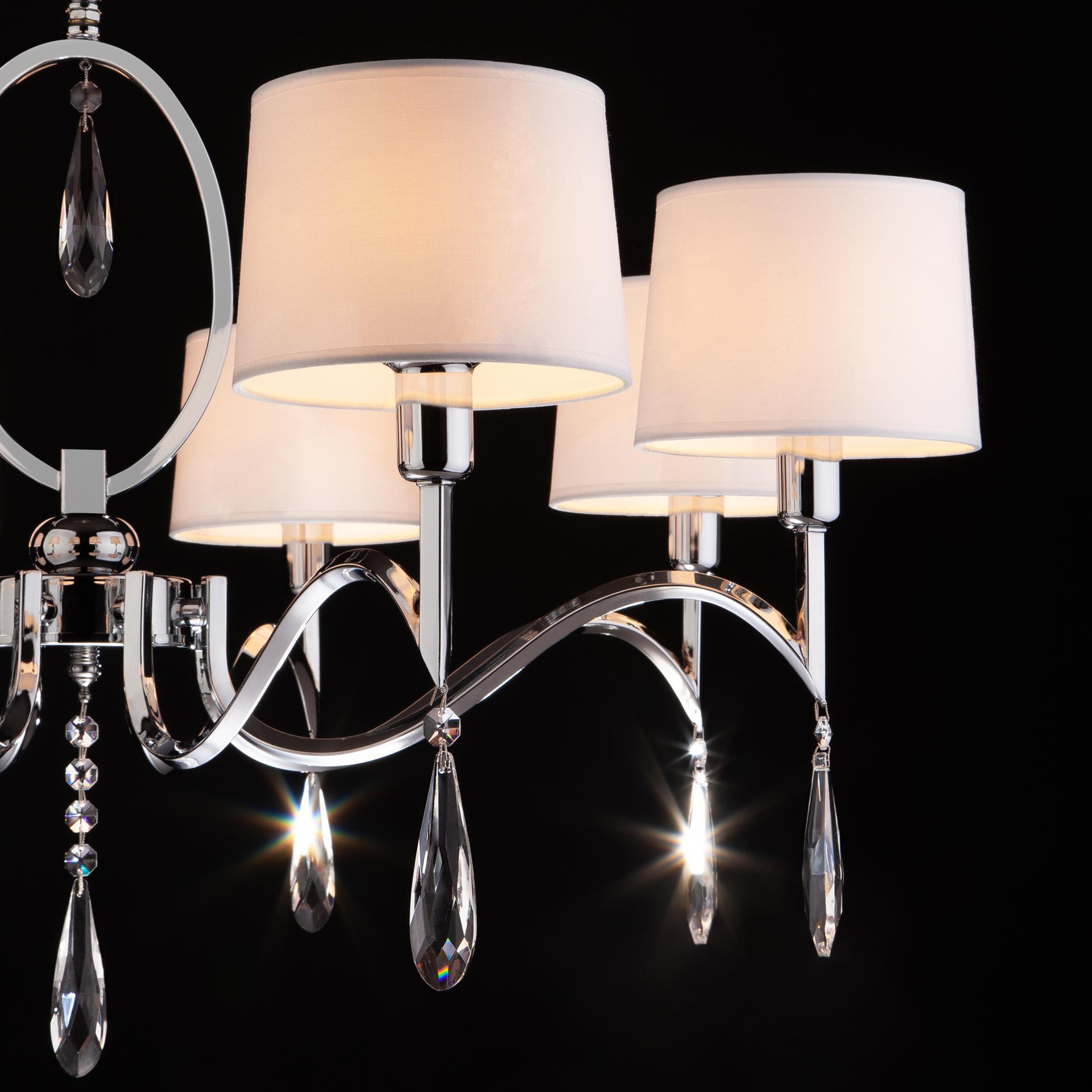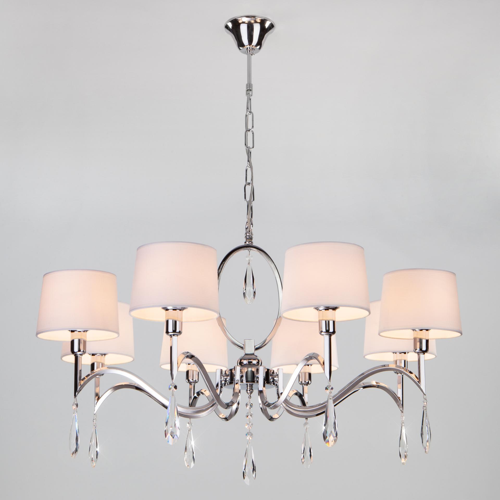 Люстра с хрусталем и абажурами 10093/8 хром/прозрачный хрусталь Strotskis предназначена для создания основного освещения в современных и классических интерьерах, подходит для различных типов помещений: гостиная, спальня и рассчитана на площадь освещения 25м². Классическая люстра оснащена патронами с цоколем Е14, которые рассчитаны на максимальную мощность ламп 40 Вт. Люстра украшена эффектным декором из хрусталя и дополнена выразительными тканевыми абажурами. Арматура изготовлена из высококачественного металла с надежным защитным покрытием. В нашем интернет-магазине вы можете купить подвесную люстру по выгодной цене.