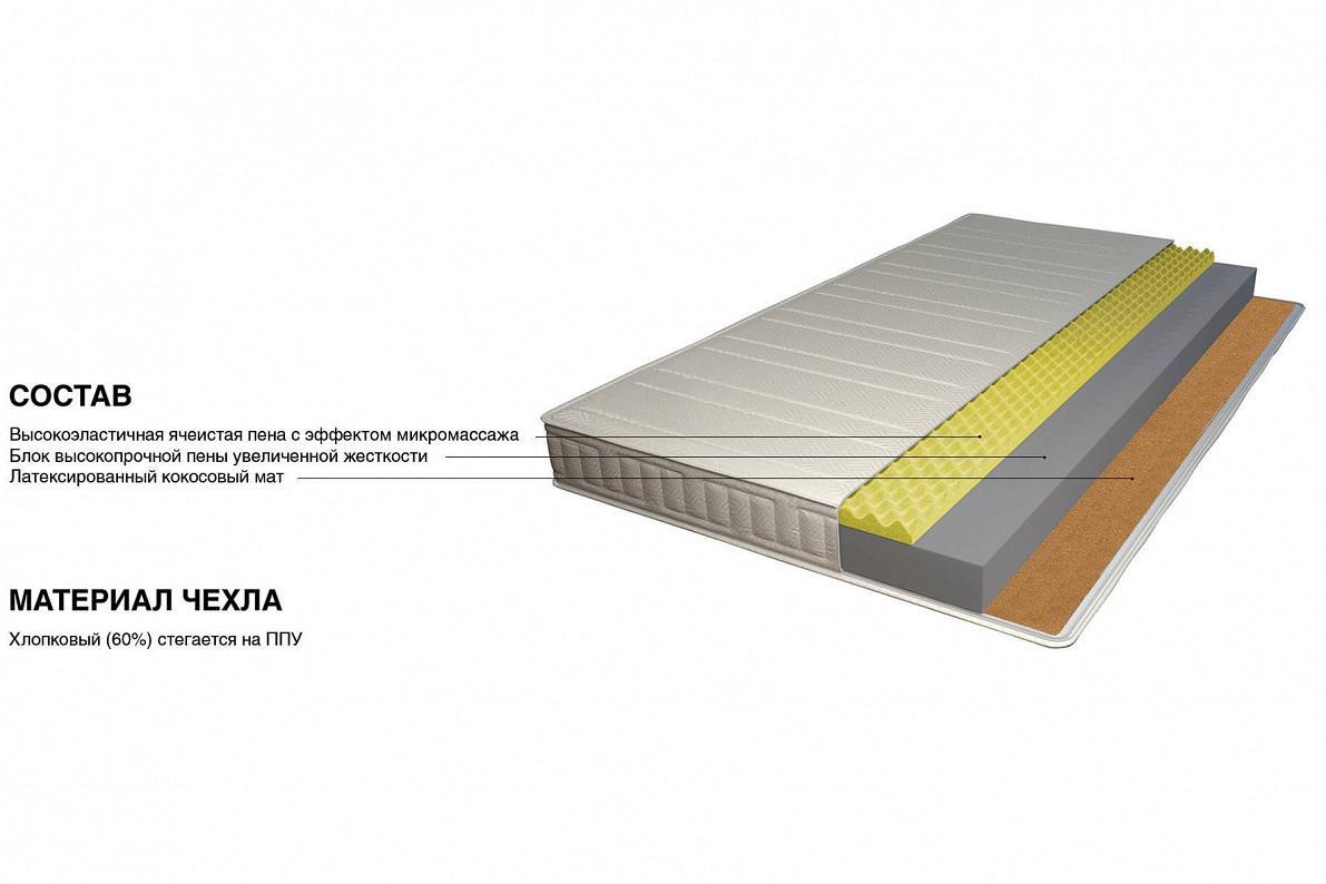 Одна из сторон матраса имеет ячеистую структуру, которая обеспечивает эффект микромассажа, вторая сторона армирована латексированным кокосовым листом, что придает дополнительную жесткость спальному месту. Все материалы абсолютно гипоаллергенны. Чехол на 60% состоит из неокрашенного хлопка.