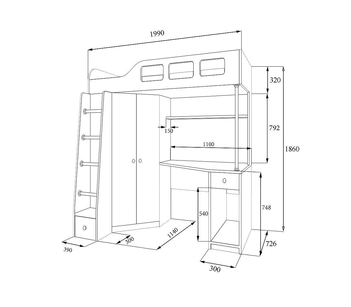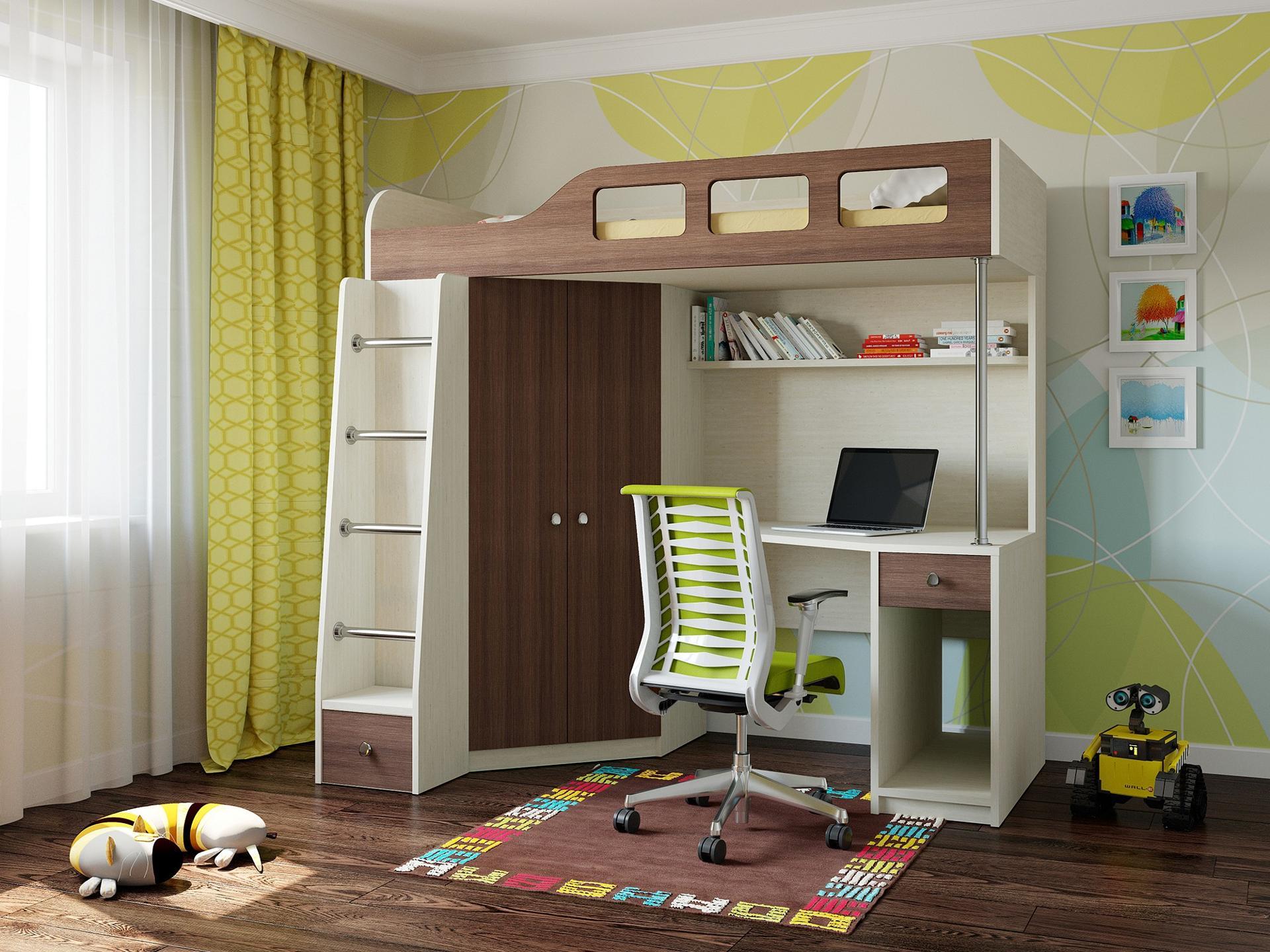 Детская кровать, как и положено, снабжена бортиками безопасности. В под кроватном пространстве большой вместительный шкаф, расположенный в углу и имеющий две створки. С боку шкафа прикреплена удобная лестница со ступенями из металлической штанги. С одной стороны оборудован рабочий стол с полкой для учебников и книг.
