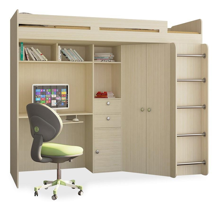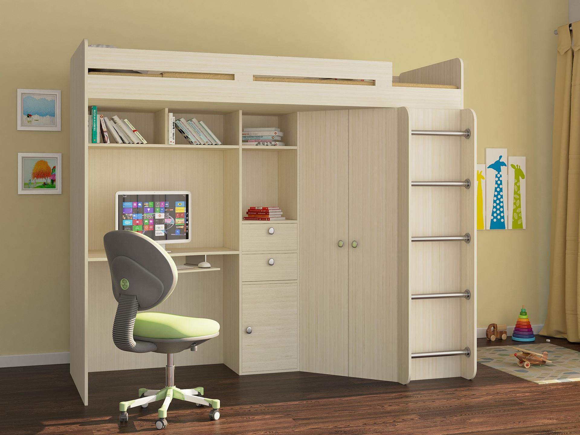 Набор для детской Астра для одного ребенка, позволяющая экономить пространство жилой комнаты. В сравнении с двухъярусной кроватью, у этой конструкции весь нижний «этаж» оборудован с пользой для дела.