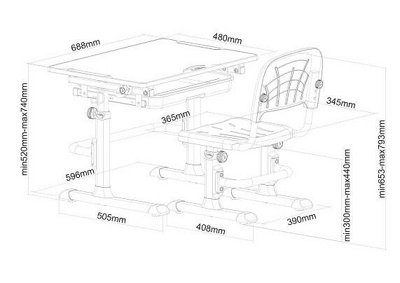Стол и стул могут быть легко отрегулированы по высоте, что позволяет оптимально адаптировать его под соответствующий рост ребенка. Механизм регулировки высоты стола: ручной.