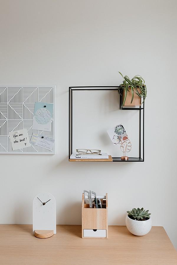 Деревянный кубический контейнер отлично дополняет композицию: он может служить подставкой для канцелярских мелочей или кашпо для цветов. Можно поставить на стол или повесить на стену (крепления в комплекте).