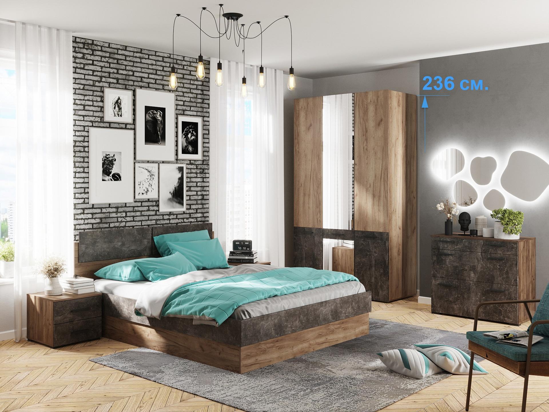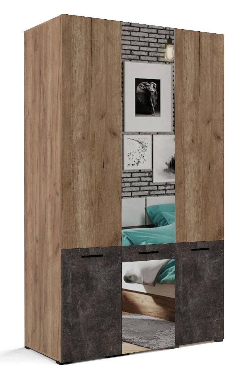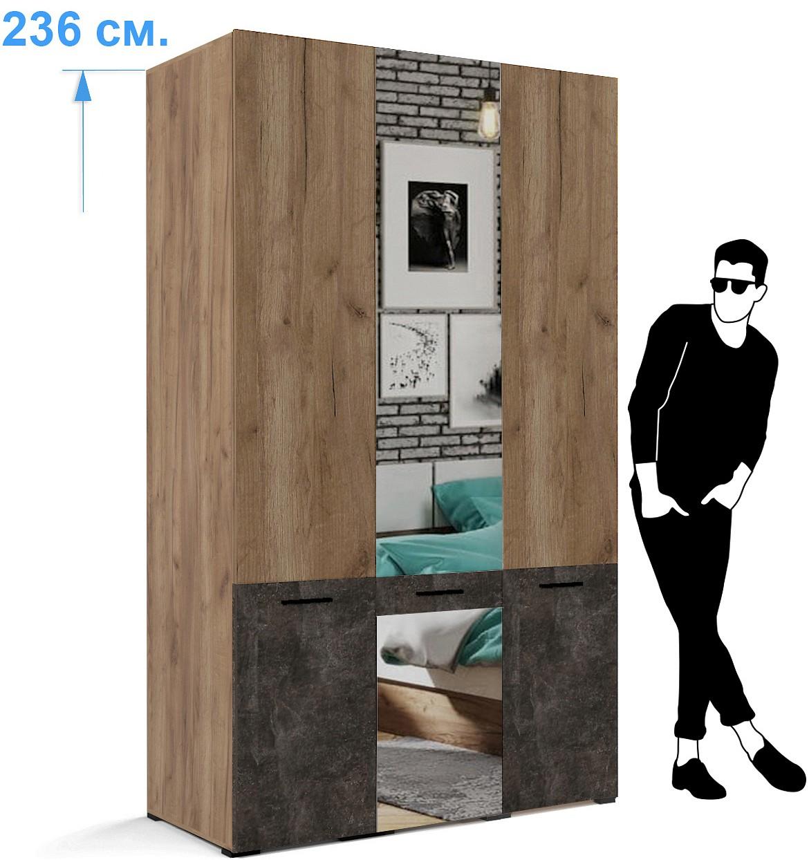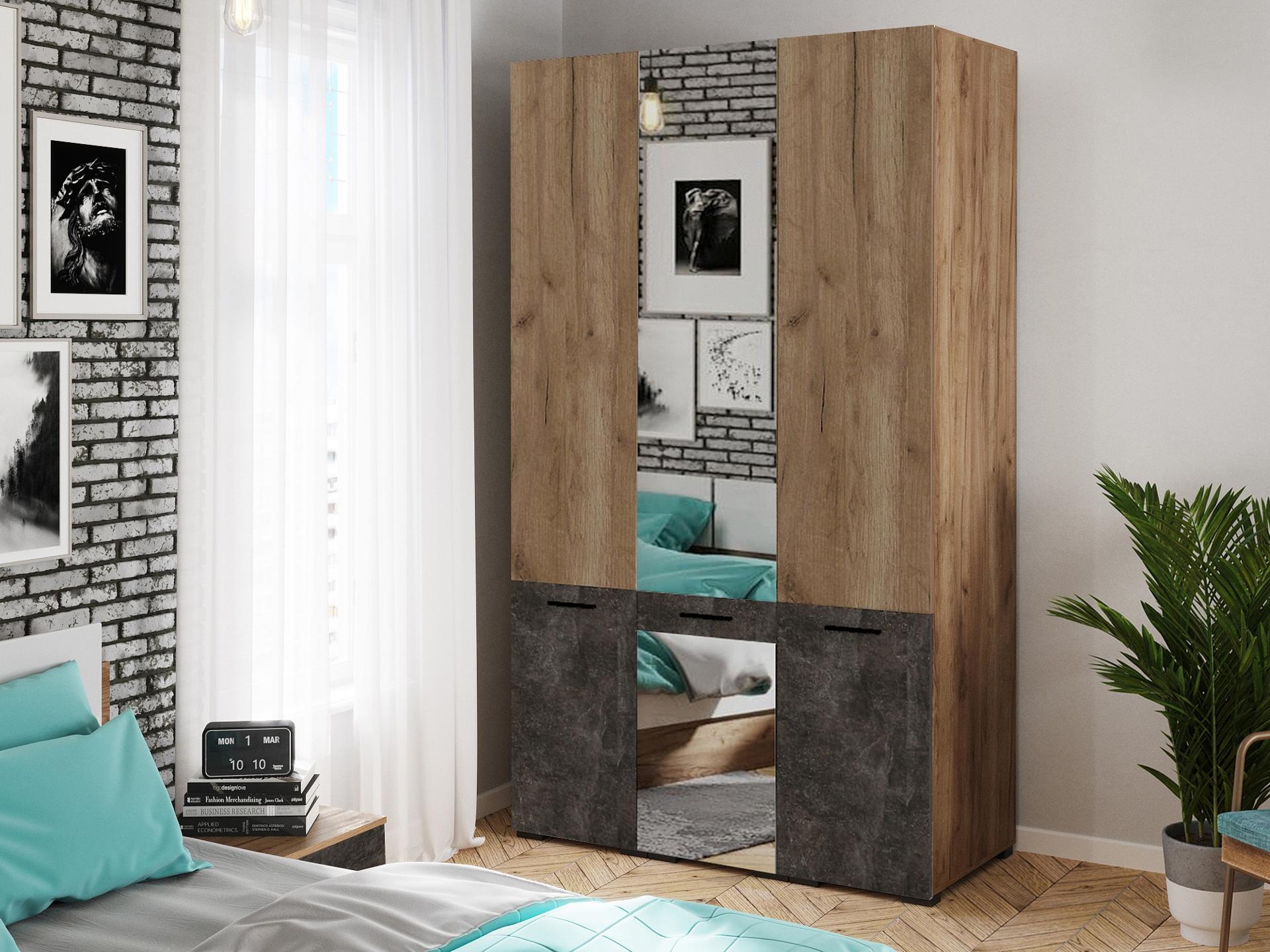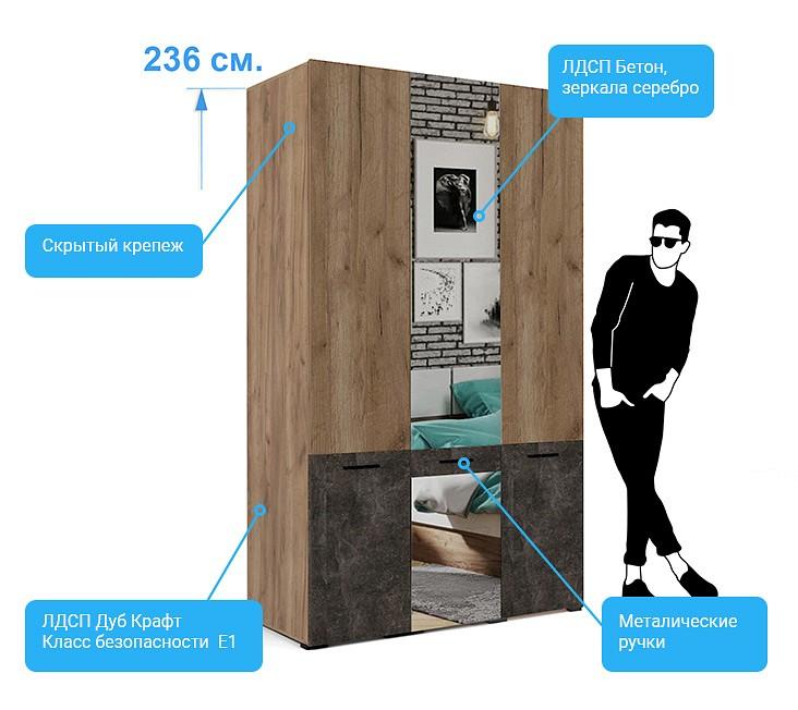 Шкаф 3-х дверный Брайтон бетон, дуб крафт, зеркальный