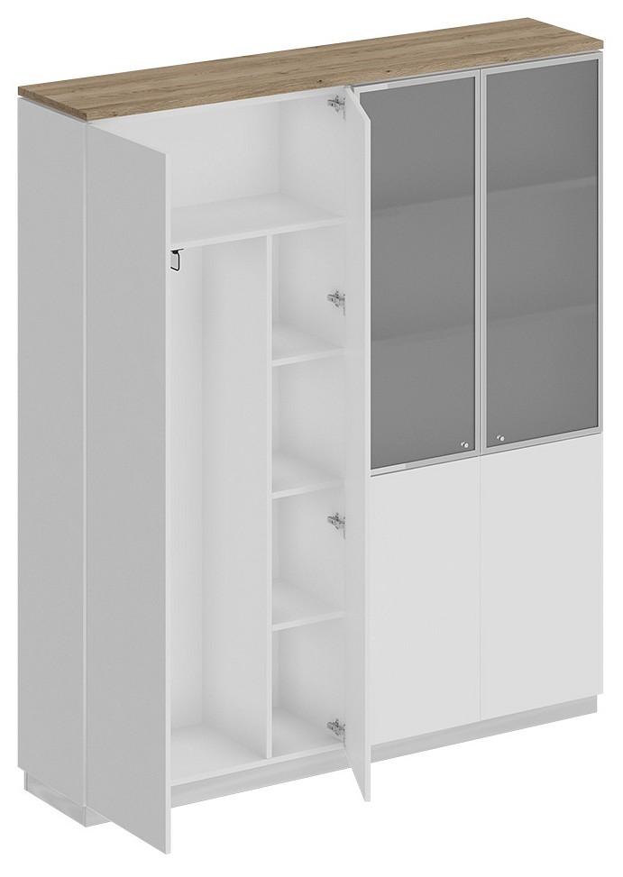 Шкаф состоит из шкафа для документов со стеклом и шкафа для одежды с дополнением под общим топом, цоколя на 2 шкафа и дверей.