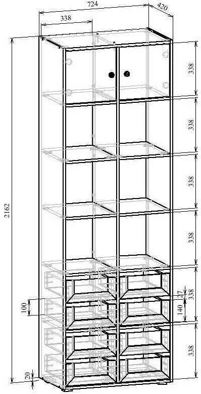 2 дверцы, 4 полки, 8 ящиков