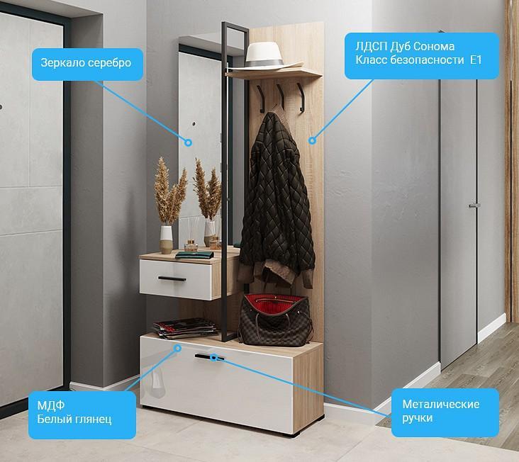 На всех внешних торцах прихожей кромки ПВХ, что обеспечивает безупречный внешний вид и долговечность. Металлические мебельные ручки, крючки для одежды и декоративная рамка прочны и надежны, со временем не изменят свой внешний вид.