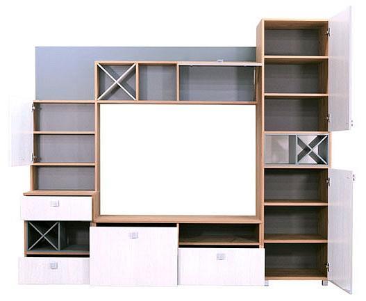 Стенка не разборная, состоит из центрального модуля, предназначенного под ТВ и верхней полки, а также шкафа и пенала, дополняющих основную часть.