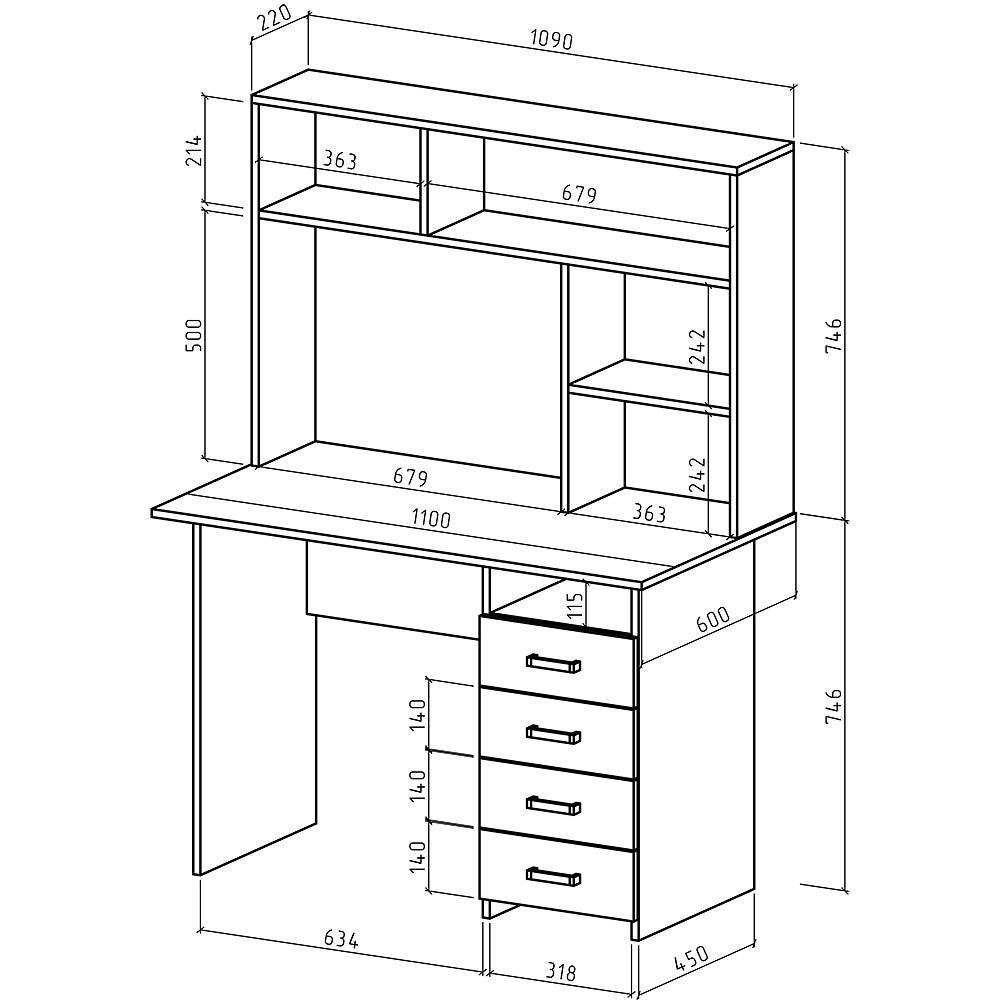 надстройка: 2 полки,тумбочка: 4 ящика